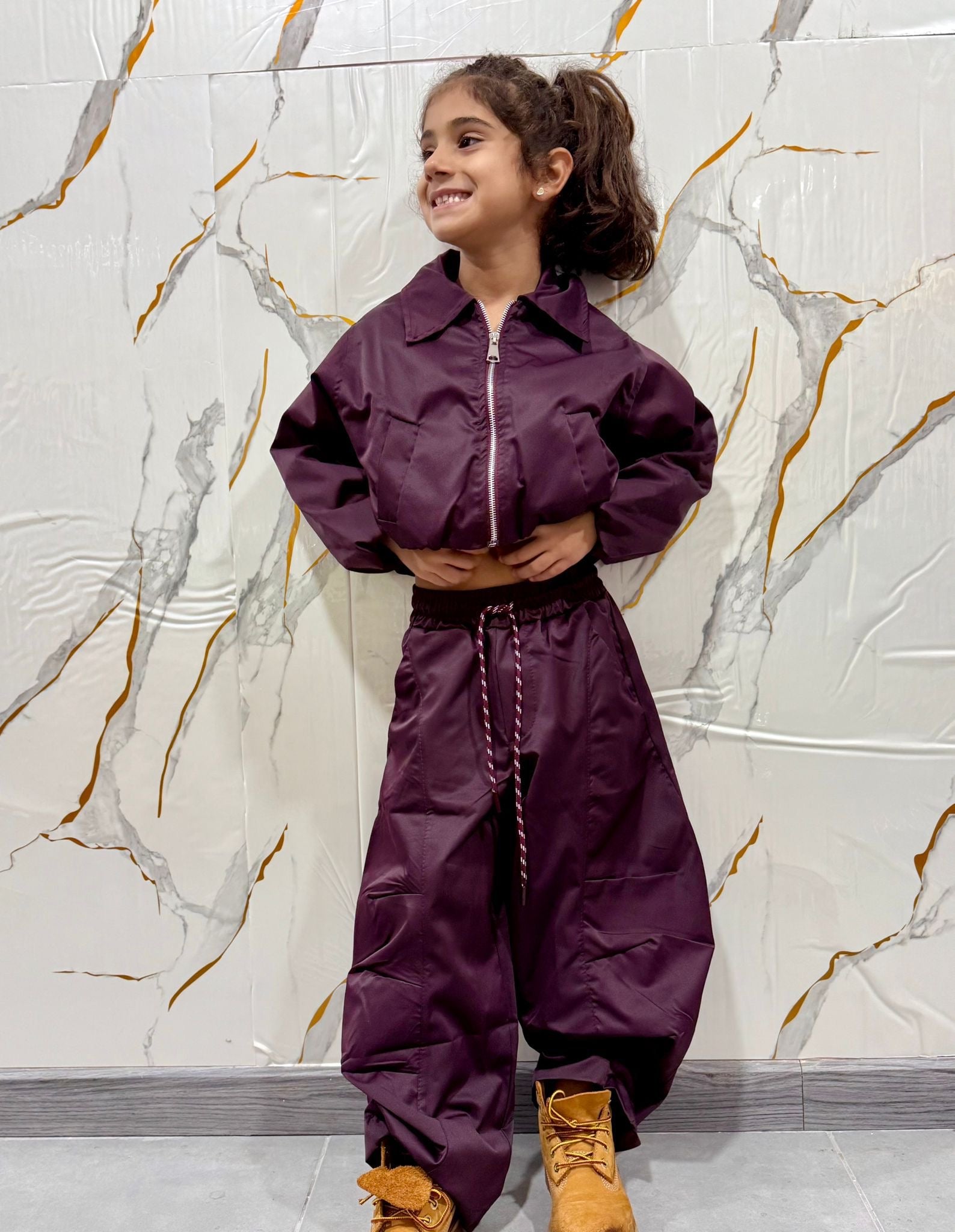 Completo bambina in tessuto tecnico felpa cropped e pantalone cargo — set sportivo borgogna
