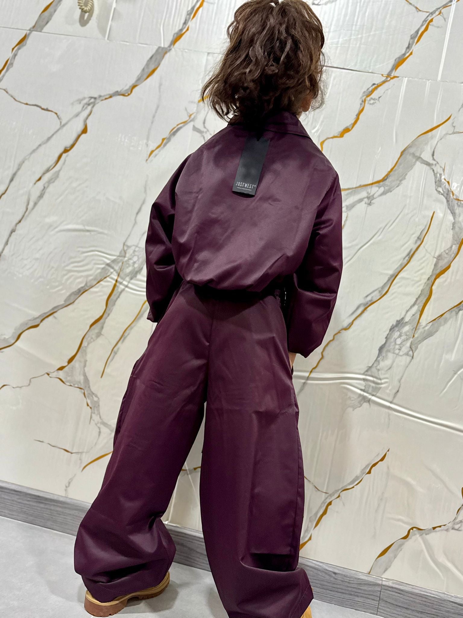 Dettaglio: Giacca cropped con zip e colletto, pantalone ampio con elastico e cordoncino regolabile in vita