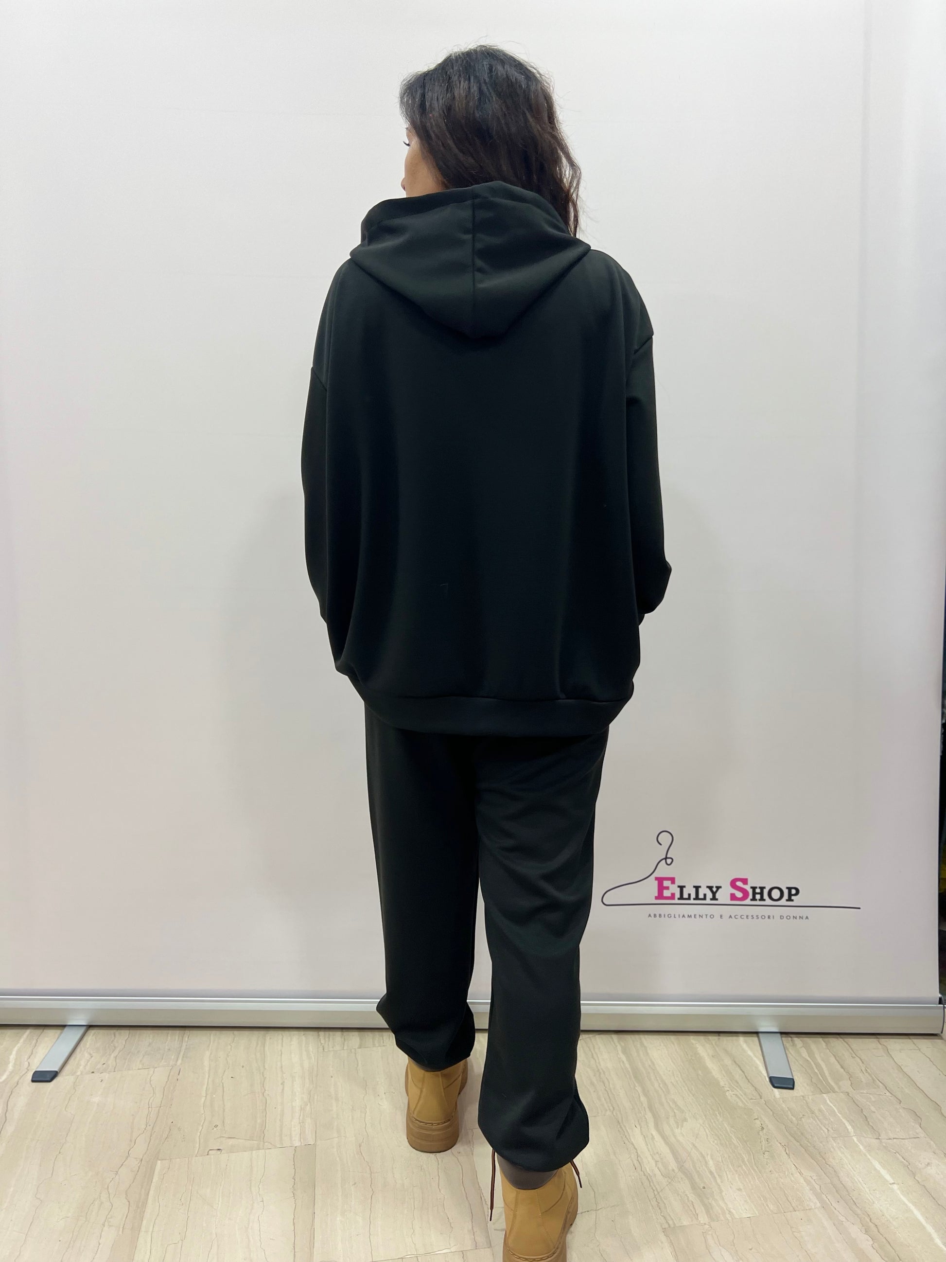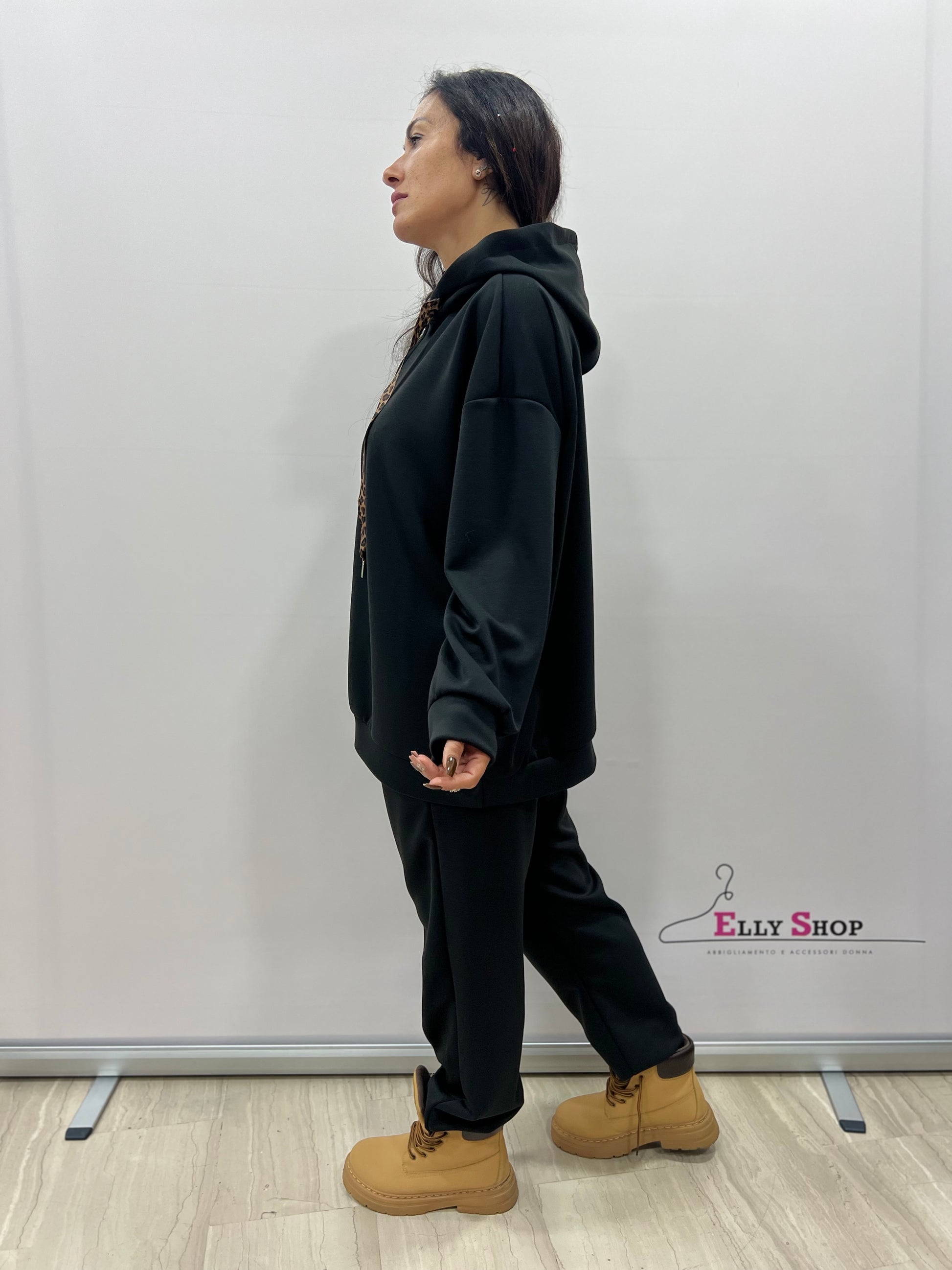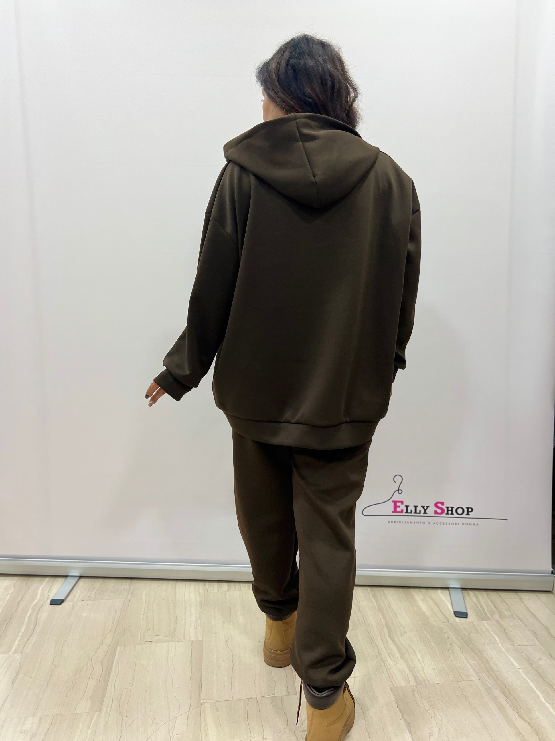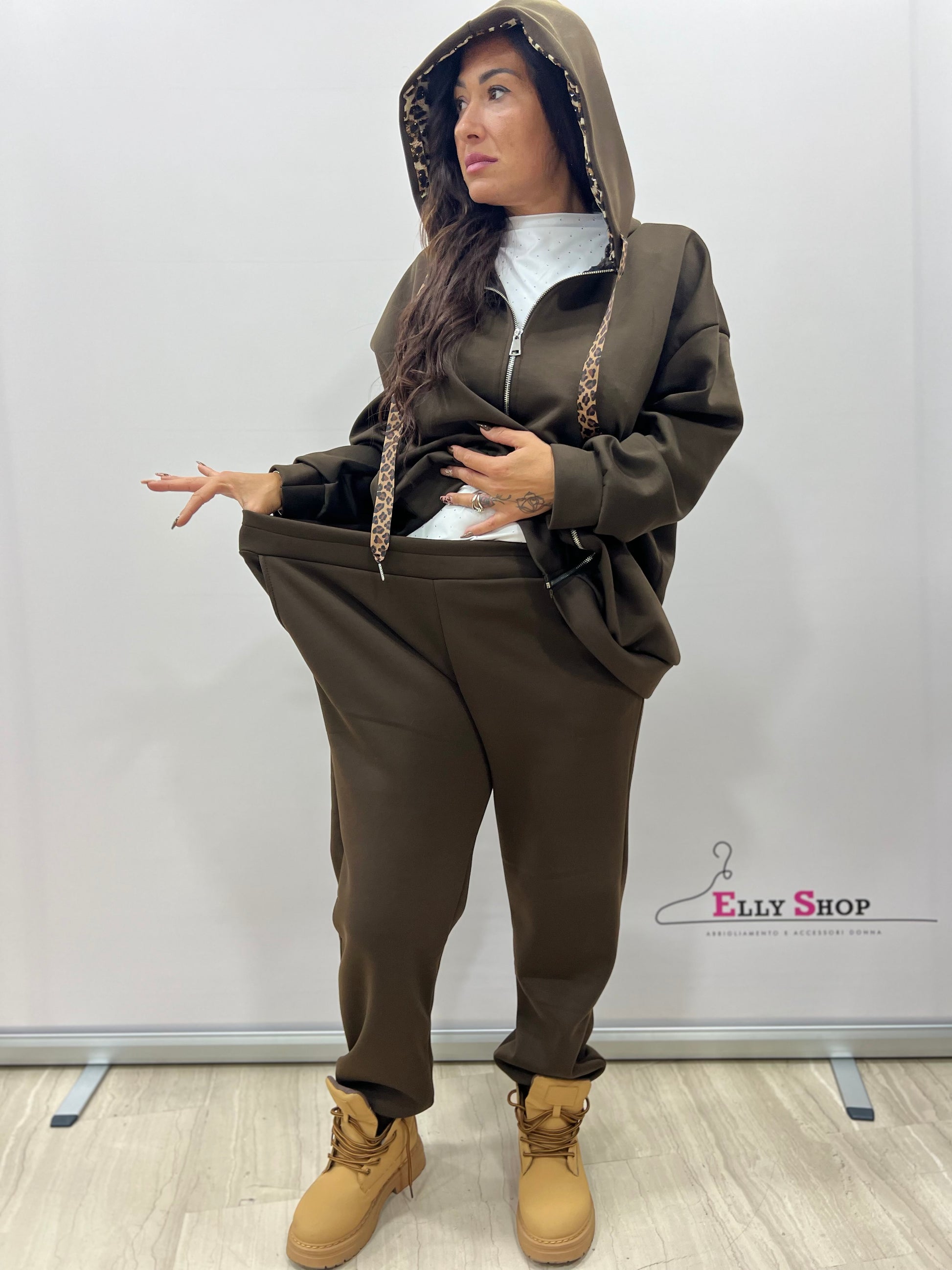 Completo donna curvy dallo stile casual e contemporaneo, perfetto per chi desidera comfort senza rinunciare alla femminilità. Il set è composto da una felpa con zip frontale e cappuccio, impreziosita da coulisse con stampa animalier e interno cappuccio coordinato, e da un pantalone morbido con elastico in vita. Realizzato in tessuto tecnico confortevole, garantisce libertà di movimento e una vestibilità perfetta per ogni silhouette. Ideale per il tempo libero, per look sportivi o per un outfit trendy e rilassato. Disponibile in un raffinato colore marrone caldo.