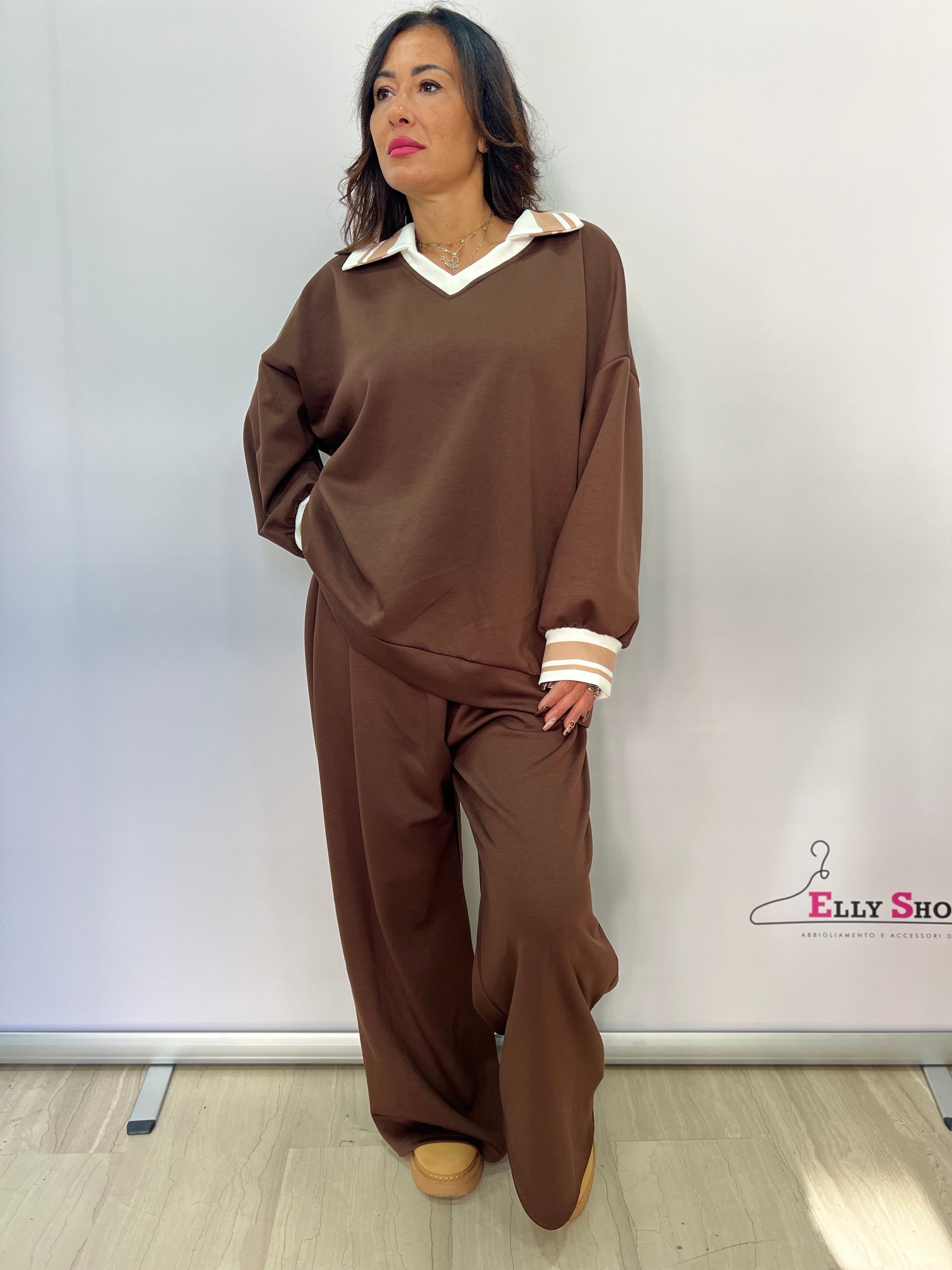 Completo casual dal taglio moderno e confortevole, composto da maglia a maniche lunghe con collo a contrasto e pantalone ampio a gamba larga. Perfetto per look quotidiani, tempo libero o viaggi, unisce praticità e stile con un tocco elegante. Il design oversize e la linea fluida garantiscono una vestibilità comoda, adatta anche alle taglie curvy. Disponibile nei colori marrone, bordeaux e vinaccio.