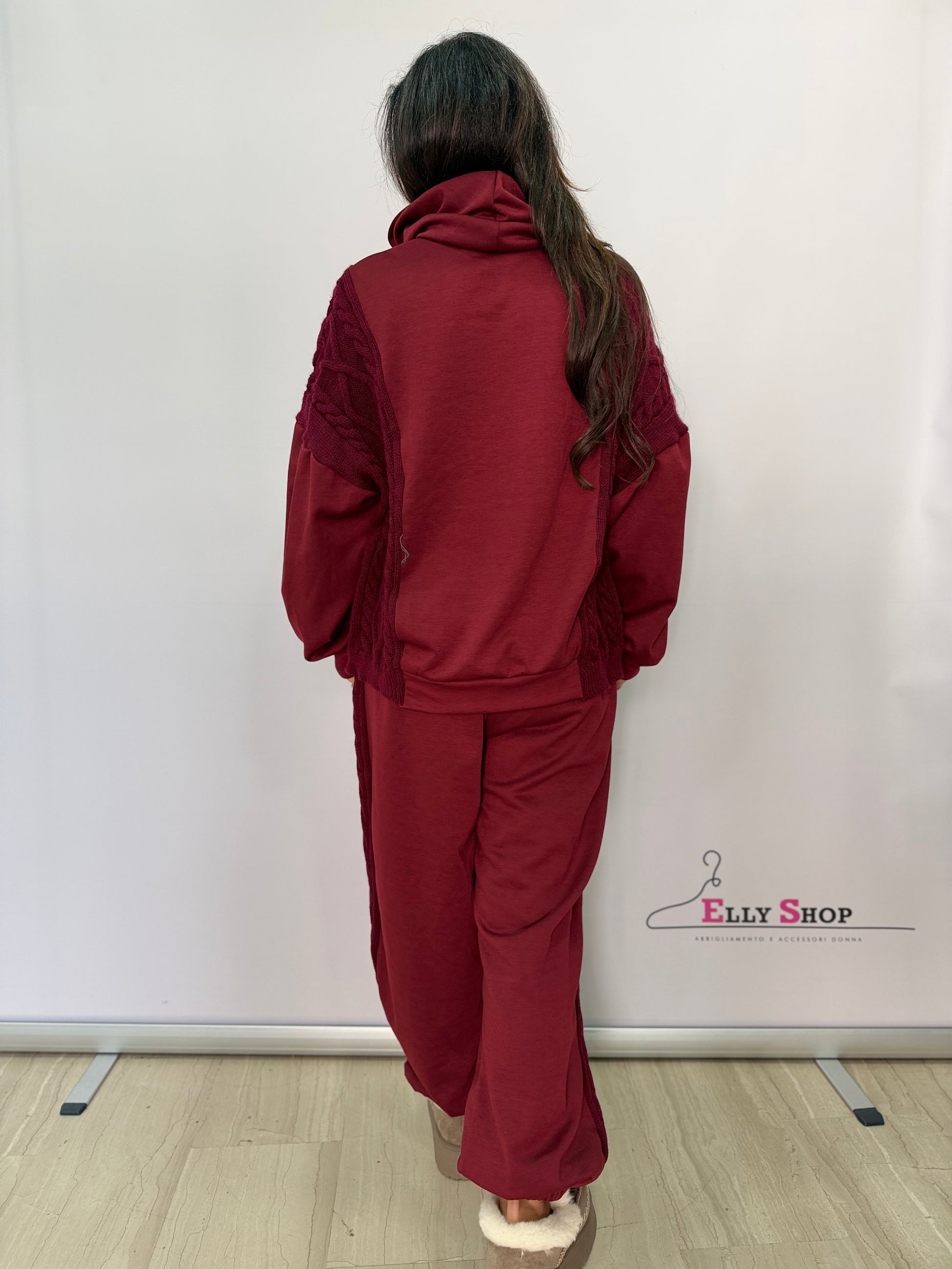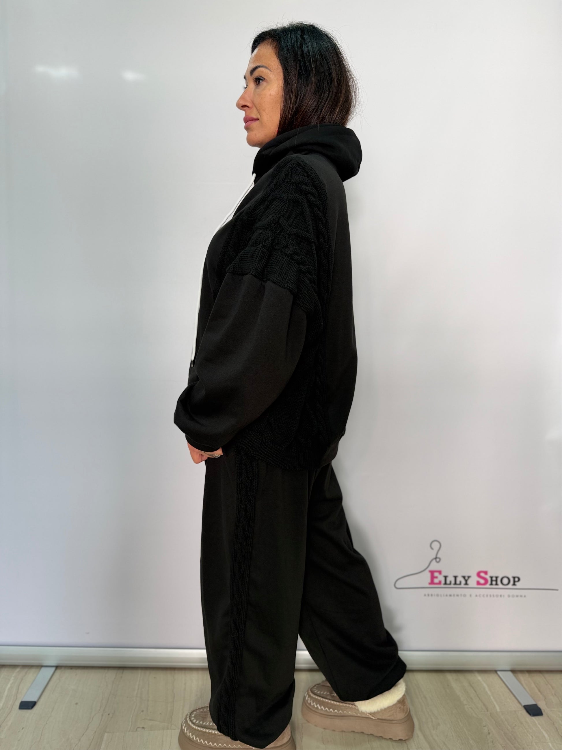 Questo completo casual donna unisce comfort e stile grazie alla felpa con cappuccio caratterizzata da inserti lavorati a maglia sulle spalle e al pantalone ampio dalla linea morbida. Perfetto per il tempo libero, per look quotidiani o per chi desidera un outfit comodo ma curato, è disponibile in tonalità versatili come marrone, bordeaux e nero. La vestibilità è ampia e valorizza le forme, ideale per la linea Curvy e adatto a diverse occasioni informali.