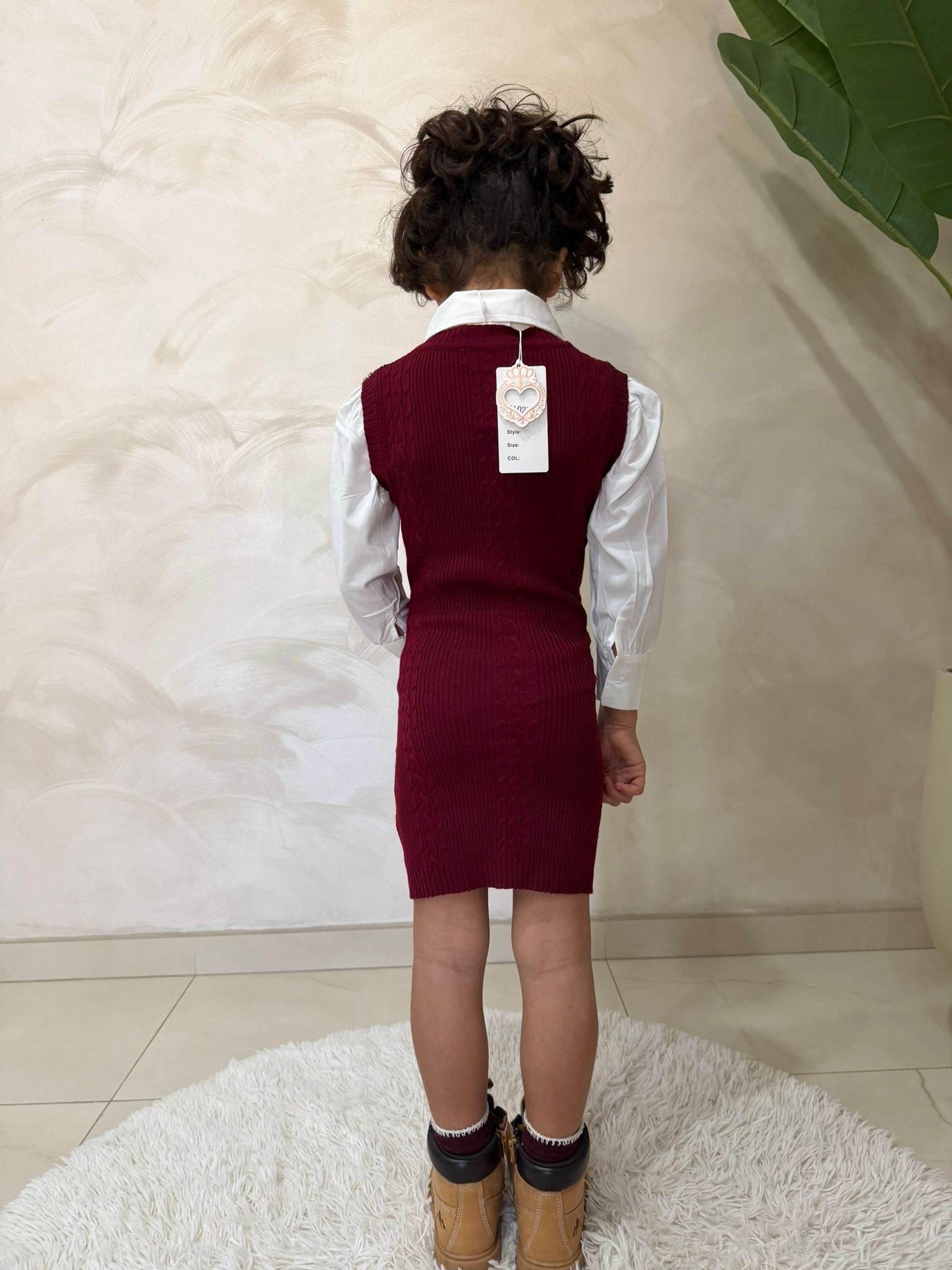 Un completo elegante e versatile composto da abito senza maniche in maglia e camicia bianca a maniche lunghe, perfetto per occasioni speciali, cerimonie o look raffinati di tutti i giorni. Il design color bordeaux, impreziosito da dettagli decorativi sulle spalle e sul colletto, dona un tocco chic, mentre la vestibilità regolare assicura comfort e libertà di movimento.