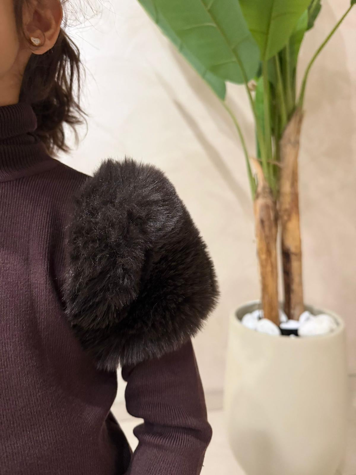 Dettaglio: Maglia a collo alto con spalline in eco-pelliccia e pantaloni abbinati