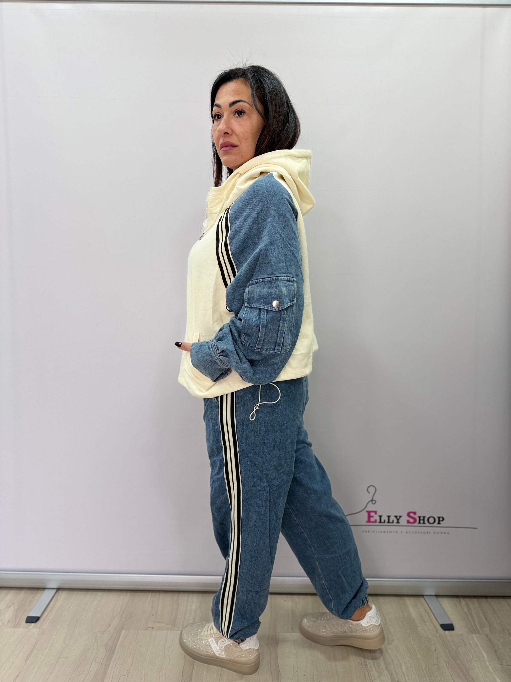 Completo donna dallo stile urban e contemporaneo, composto da felpa con cappuccio e pantalone coordinato in un originale mix di tessuto felpato e denim. Il design sporty è valorizzato da inserti a contrasto sulle spalle e sui lati del pantalone, che donano carattere e personalità al look. La vestibilità è comoda e rilassata, ideale per il tempo libero, viaggi e outfit casual dal gusto moderno. Disponibile in diverse varianti colore, perfette per chi ama uno stile dinamico ma curato.