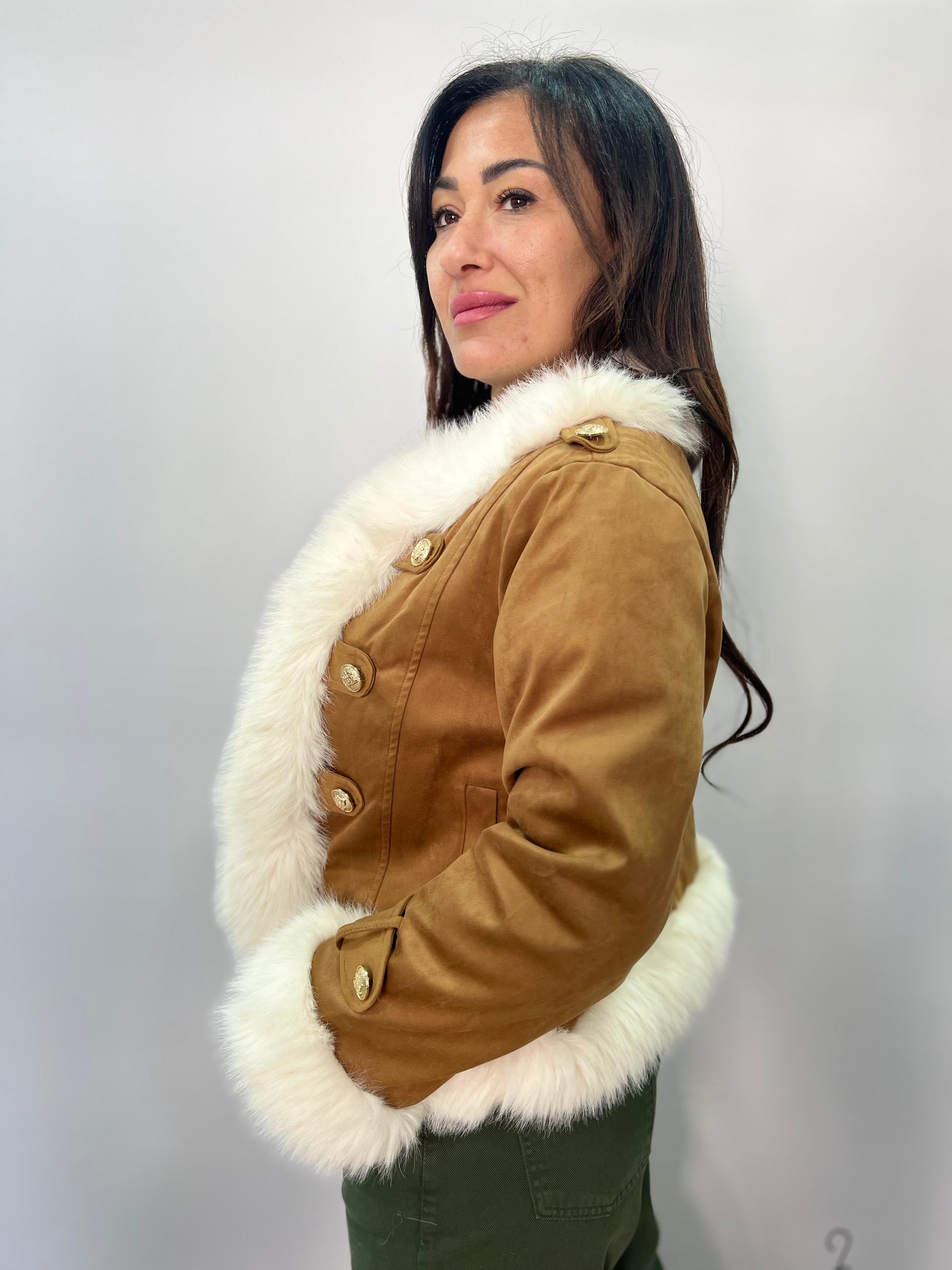 Giacca donna dal carattere deciso ed elegante, impreziosita da morbidi profili in eco pelliccia a contrasto che valorizzano il design e donano un tocco raffinato al look. La linea corta e strutturata garantisce una vestibilità confortevole e femminile, perfetta per completare outfit casual chic o più ricercati. Ideale da indossare nelle mezze stagioni o nelle giornate fredde, si abbina facilmente a pantaloni, jeans o gonne. Disponibile in diverse varianti colore, pensate per adattarsi a ogni stile.