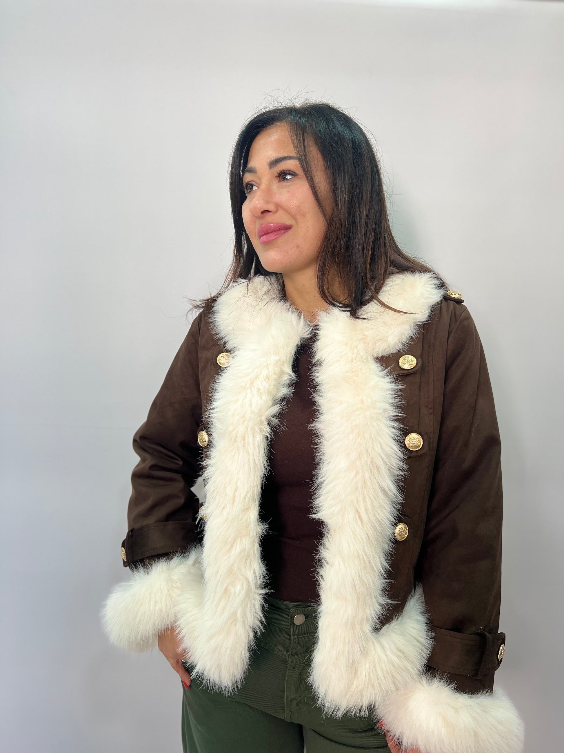 Dettaglio: Profili in eco pelliccia su collo, apertura frontale, fondo e polsini, chiusura con bottoni decorativi