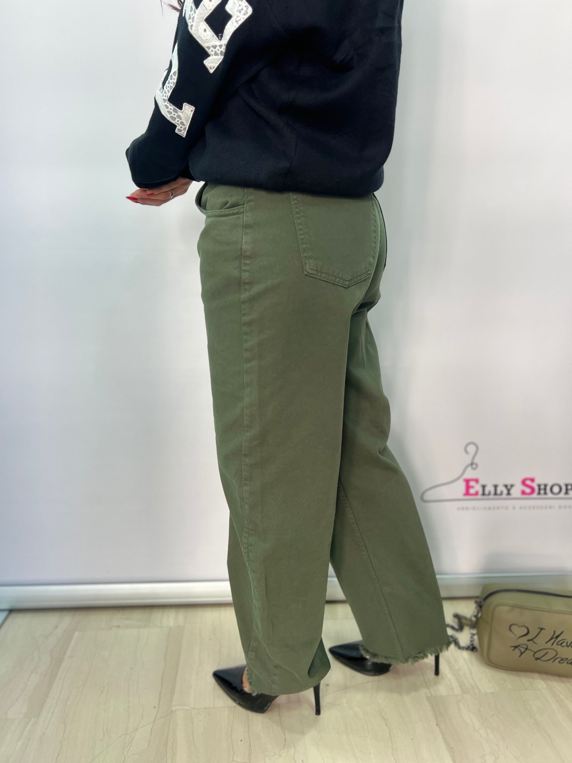 Dettaglio: Modello a gamba dritta con chiusura frontale a bottone e zip, tasche anteriori e posteriori, fondo sfrangiato