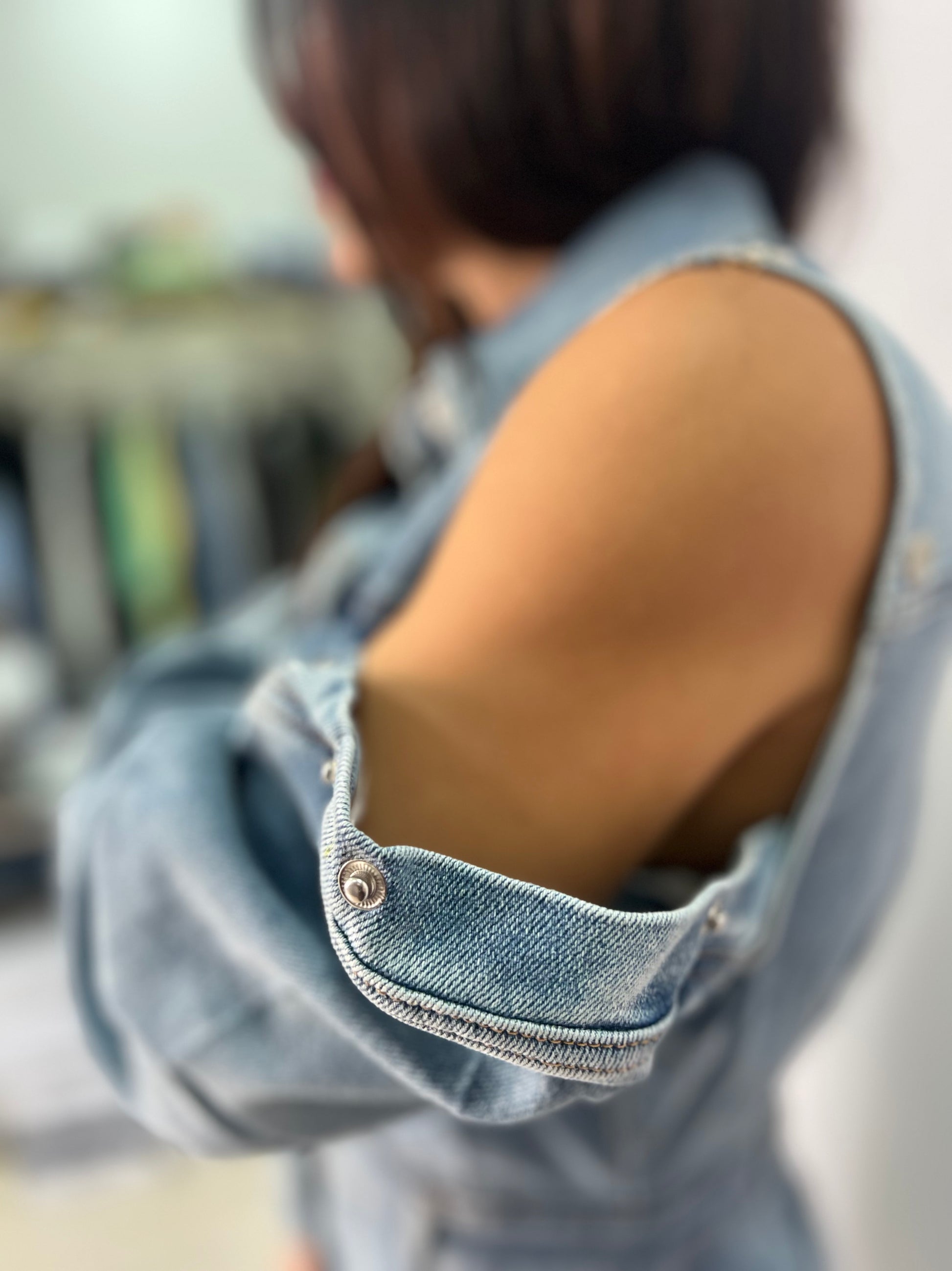 Abito chemisier in denim dal design moderno e versatile, perfetto per creare look casual di tendenza con un tocco originale. Il modello presenta colletto classico, chiusura frontale con bottoni e linea leggermente sagomata in vita che valorizza la silhouette. Le maniche lunghe sono rimovibili grazie ai pratici bottoni sulle spalle, permettendo di trasformare l’abito in una versione smanicata per adattarsi a diverse stagioni e occasioni. Dotato di tasche frontali e laterali, unisce stile e funzionalità. Il lavaggio denim chiaro lo rende facile da abbinare a stivali, sneakers o décolleté per outfit sempre attuali. Vestibilità regolare.