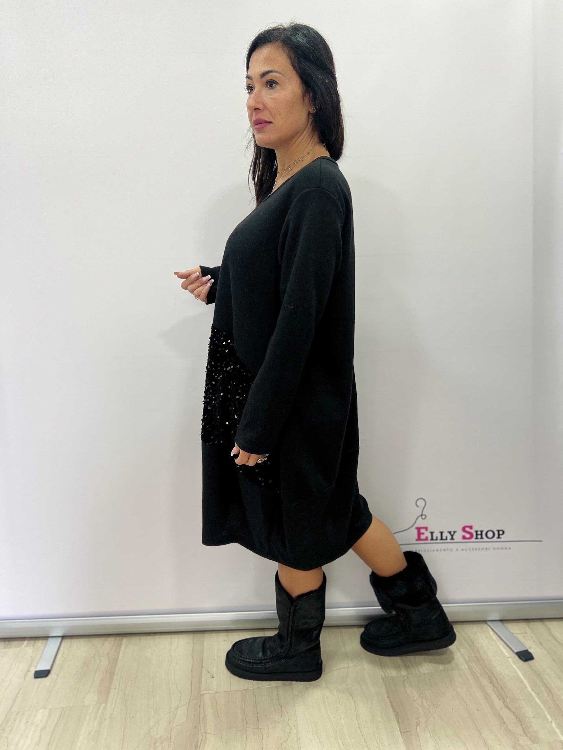 Abito casual-chic caratterizzato da una morbida linea ampia e da un elegante inserto di paillettes che dona luce e movimento al look. Perfetto per creare outfit comodi ma raffinati, ideali per il tempo libero, per occasioni informali o per serate in cui si vuole brillare con discrezione. Disponibile in colori versatili e femminili, veste in modo confortevole adattandosi facilmente alle forme curvy. Taglia unica, consigliata dalla 44 fino alla 54.