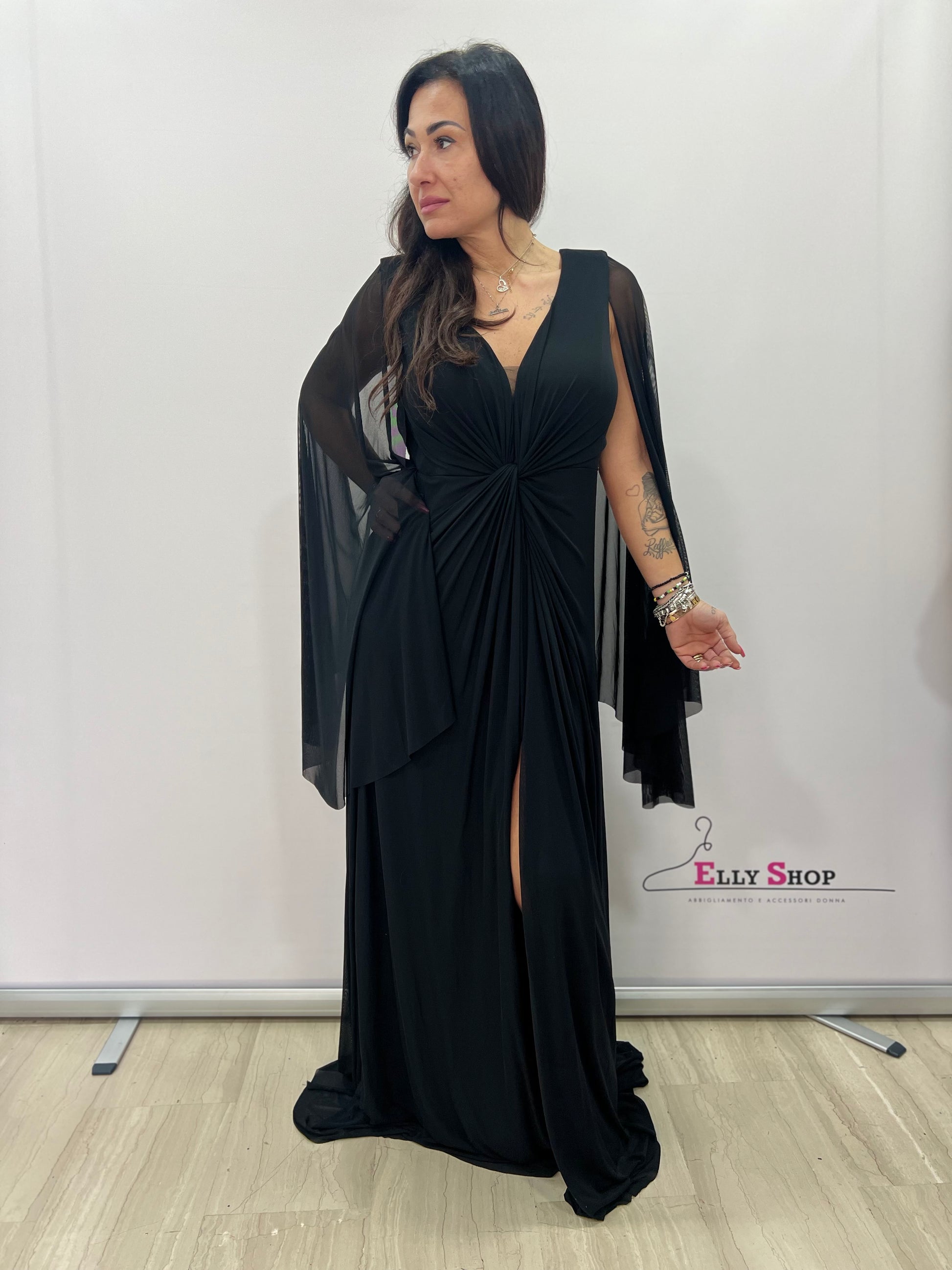 Abito lungo dal fascino sofisticato e femminile, pensato per valorizzare le silhouette curvy con eleganza e armonia. Il design con scollo a V profondo e drappeggio centrale effetto nodo esalta il décolleté e definisce il punto vita, mentre la gonna fluida con spacco laterale dona slancio alla figura e un tocco sensuale ma raffinato. Le maniche in chiffon trasparente stile mantella creano movimento e leggerezza ad ogni passo, rendendo questo modello perfetto per cerimonie, eventi serali, gala e occasioni speciali. Disponibile nel classico e intramontabile nero, ideale per un look chic e senza tempo. Vestibilità morbida e confortevole, studiata per adattarsi alle forme dalla 2XL alla 4XL.