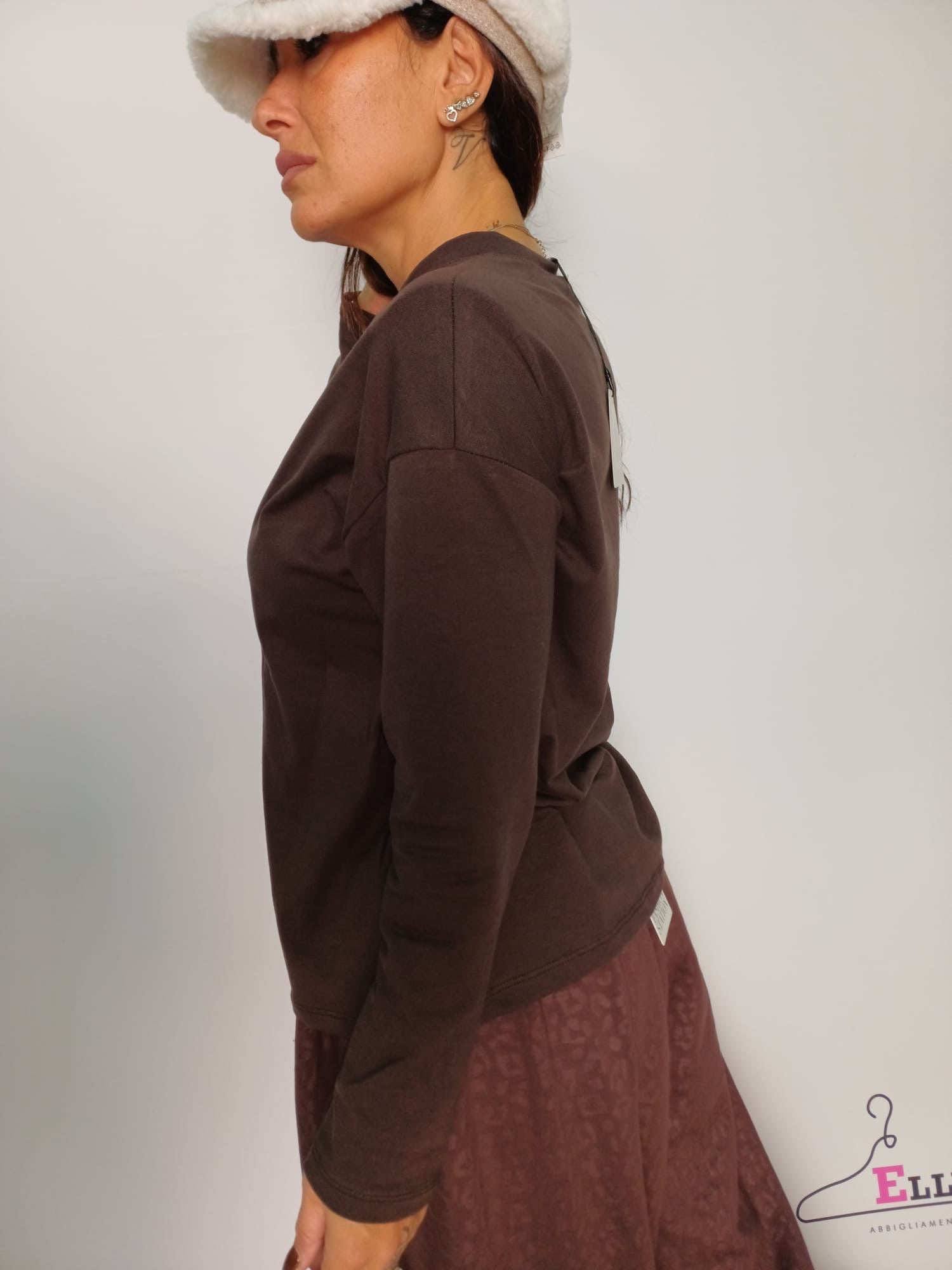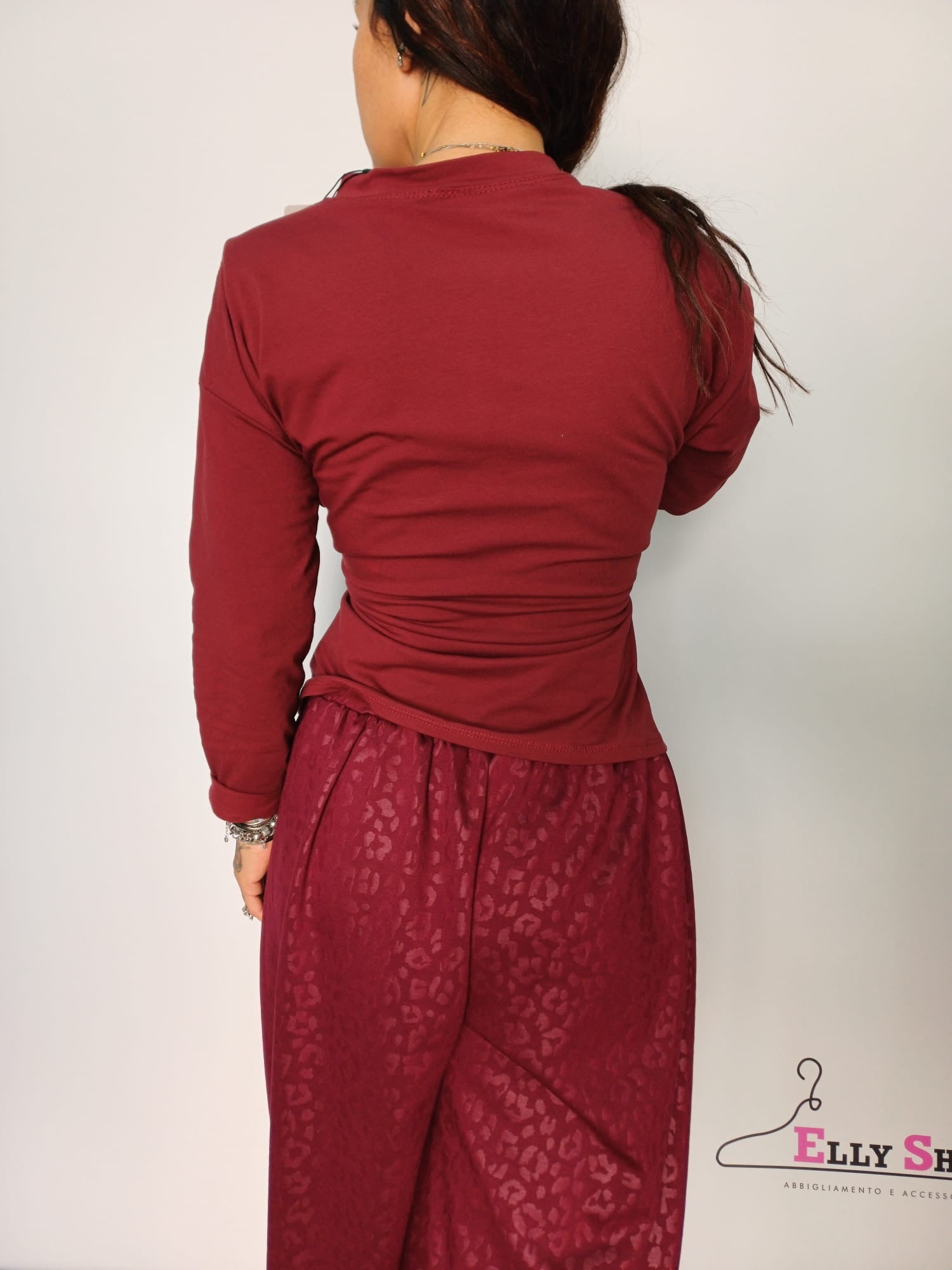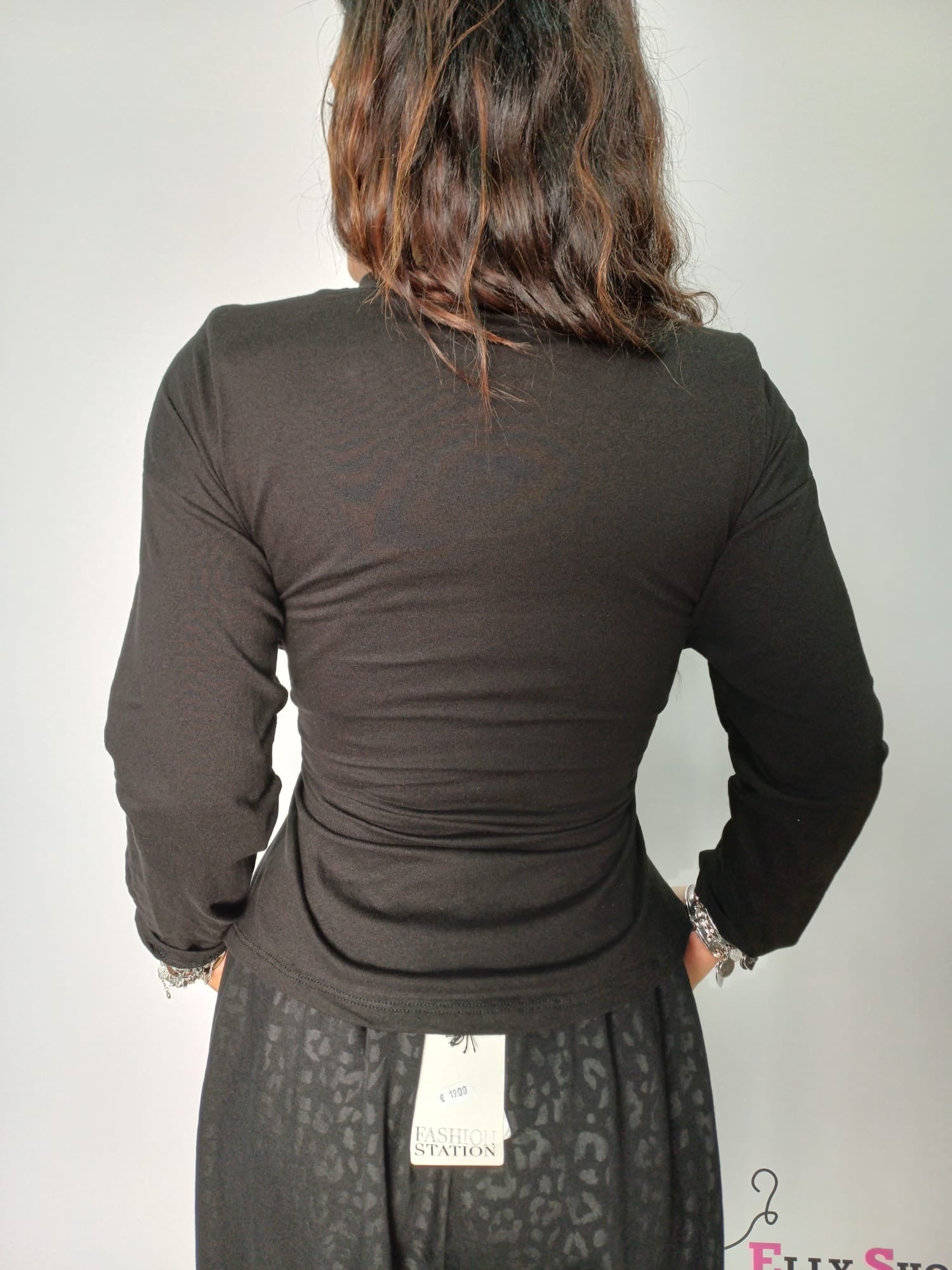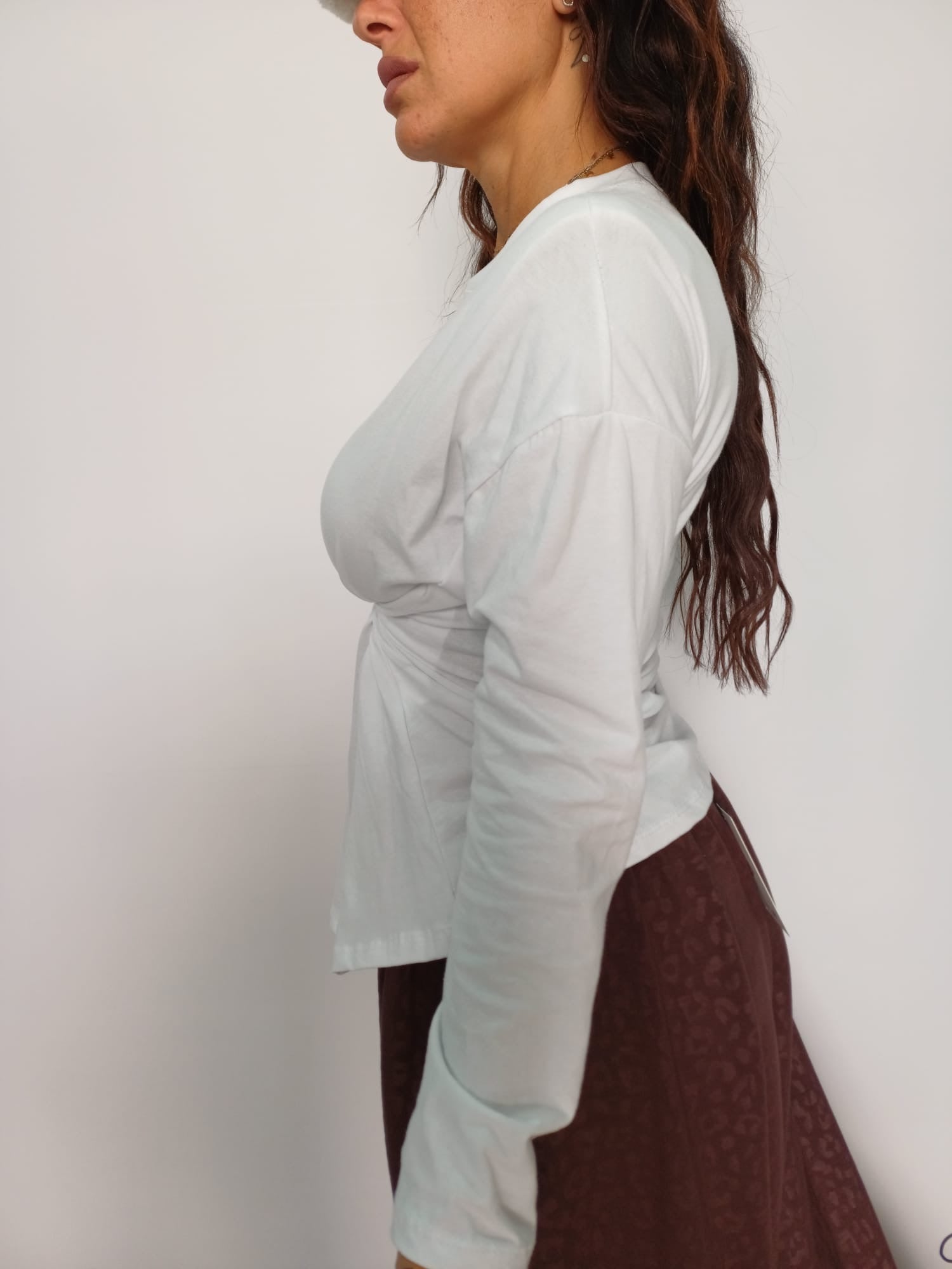 Blusa dallo stile contemporaneo e femminile, caratterizzata da un leggero arriccio centrale che valorizza la silhouette con eleganza. Realizzata in un tessuto morbido e confortevole, presenta una linea fluida con maniche lunghe e scollo tondo, perfetta per un look casual chic da giorno o per un outfit sofisticato da sera. Facile da abbinare a pantaloni o gonne a vita alta, è disponibile in una palette raffinata di colori: bianco, nero, bordeaux e marrone. La vestibilità è morbida e adatta a diverse fisicità.
