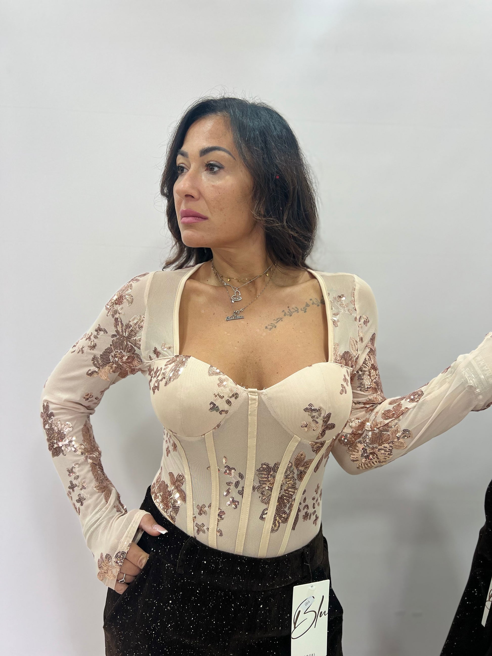 Questo body elegante unisce trasparenze sofisticate e ricami luminosi, creando un capo sensuale e raffinato ideale per look serali, eventi speciali o abbinamenti fashion con denim a vita alta. Il design si distingue per le maniche lunghe in tulle trasparente, decorate con paillettes nere in motivo floreale, e per la struttura del bustier che valorizza la silhouette con un effetto contenitivo e modellante. Disponibile nei toni nero e beige, offre una vestibilità aderente e femminile.