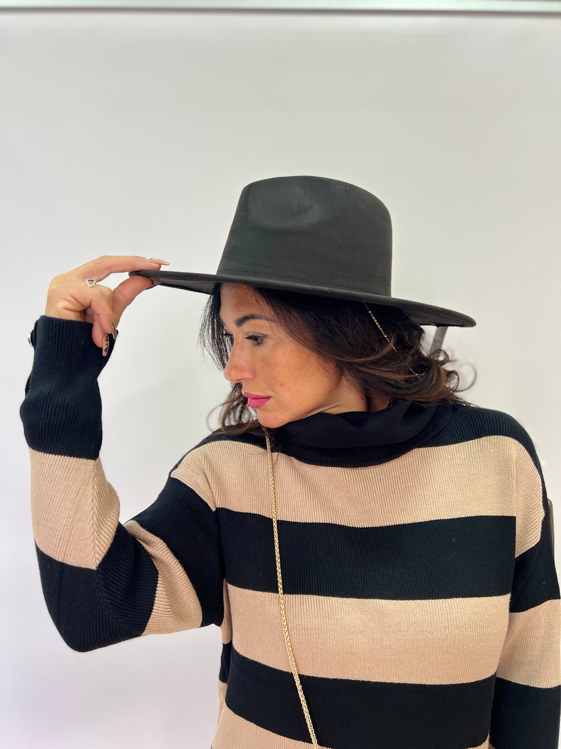 Raffinato e di grande tendenza, questo cappello a tesa larga dona un tocco chic e sofisticato a qualsiasi outfit. La struttura rigida e ben modellata ne definisce la forma elegante, mentre la finitura opaca regala un aspetto moderno e versatile. Perfetto per completare look casual o più ricercati, è l’accessorio ideale per le stagioni autunnali e invernali, da abbinare a cappotti, trench o abiti in maglia per un risultato impeccabile.