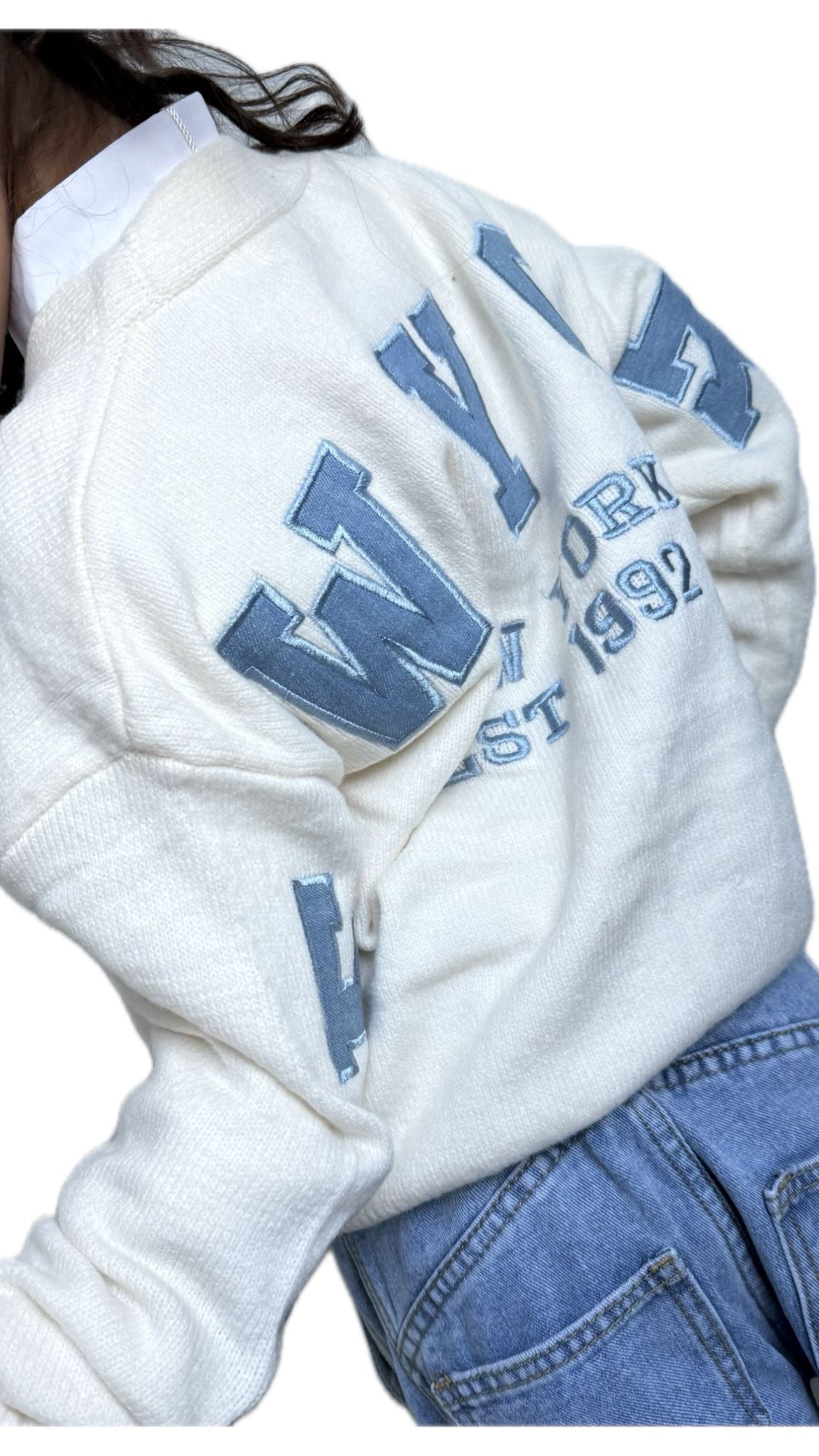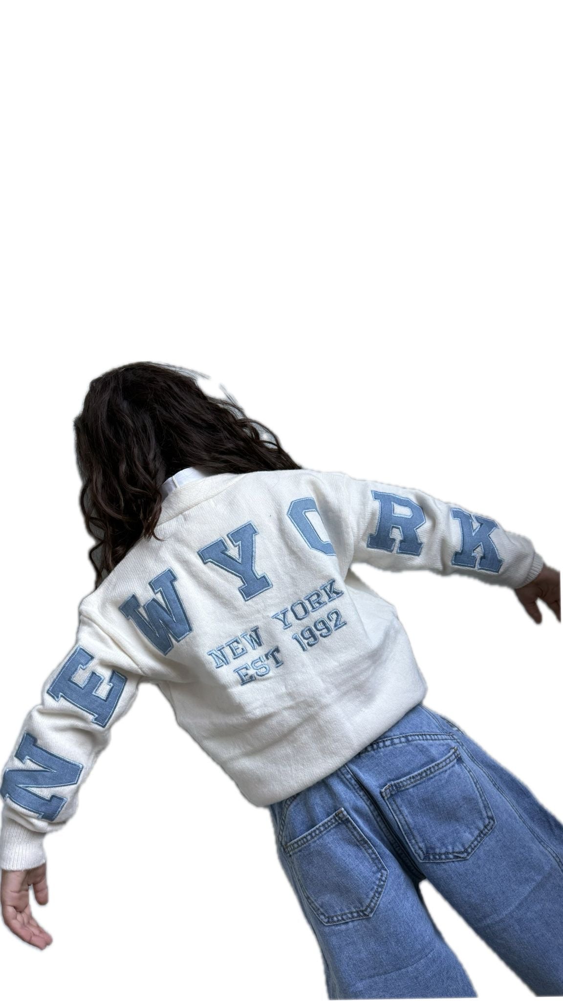 Dettaglio: Chiusura con bottoni frontali, ricami “NY” su petto, maniche e schiena