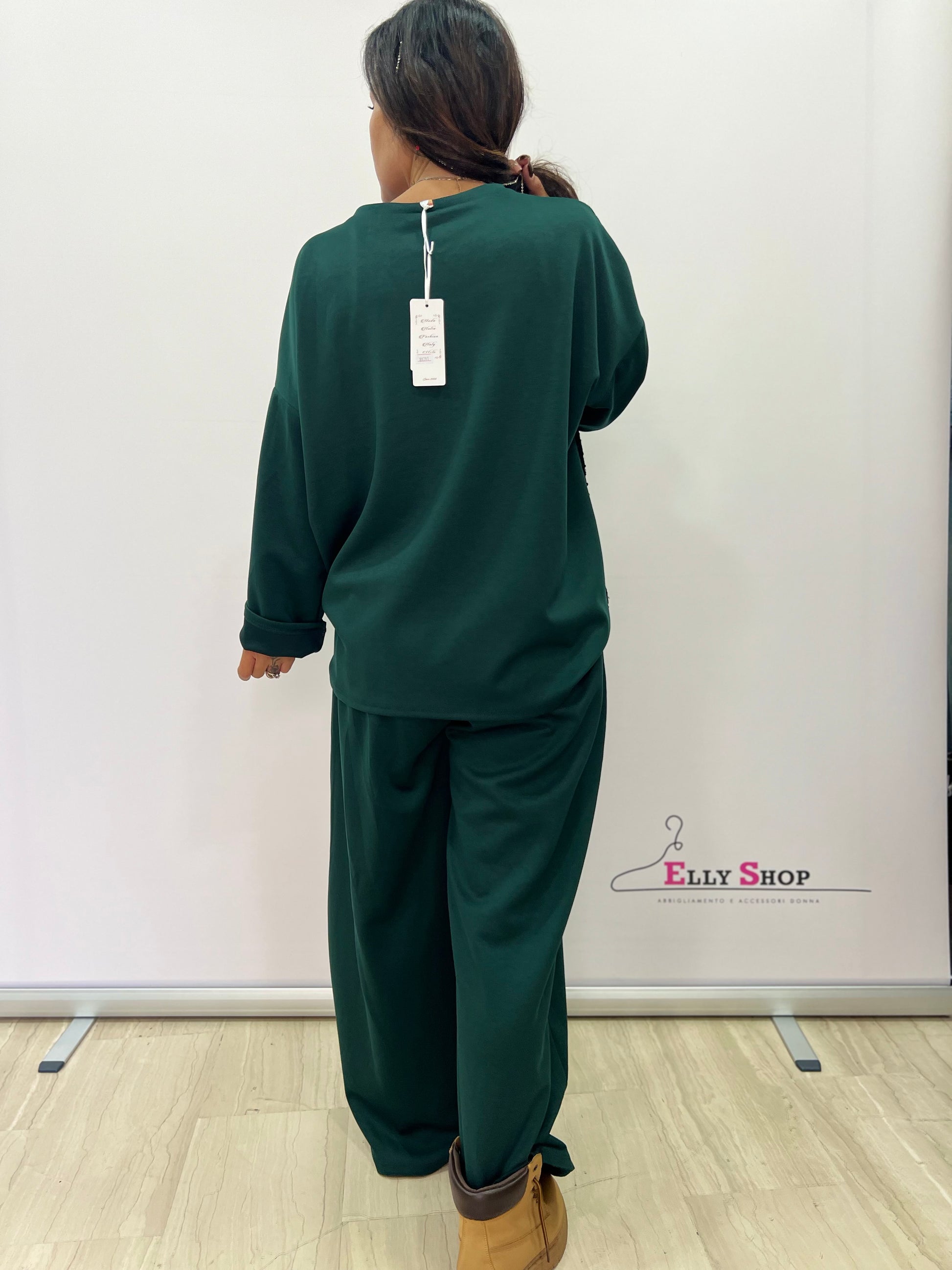 Completo curvy dal design moderno e ricercato, caratterizzato da un morbido taglio over che assicura comfort e libertà di movimento. Il top con maniche ampie e fondo asimmetrico si abbina perfettamente ai pantaloni ampi con inserti in paillettes tono su tono, creando un effetto elegante e luminoso. Perfetto per occasioni casual chic, serate informali o eventi in cui si desidera un look comodo ma sofisticato. Disponibile nei colori bordeaux, marrone, verde e nero.