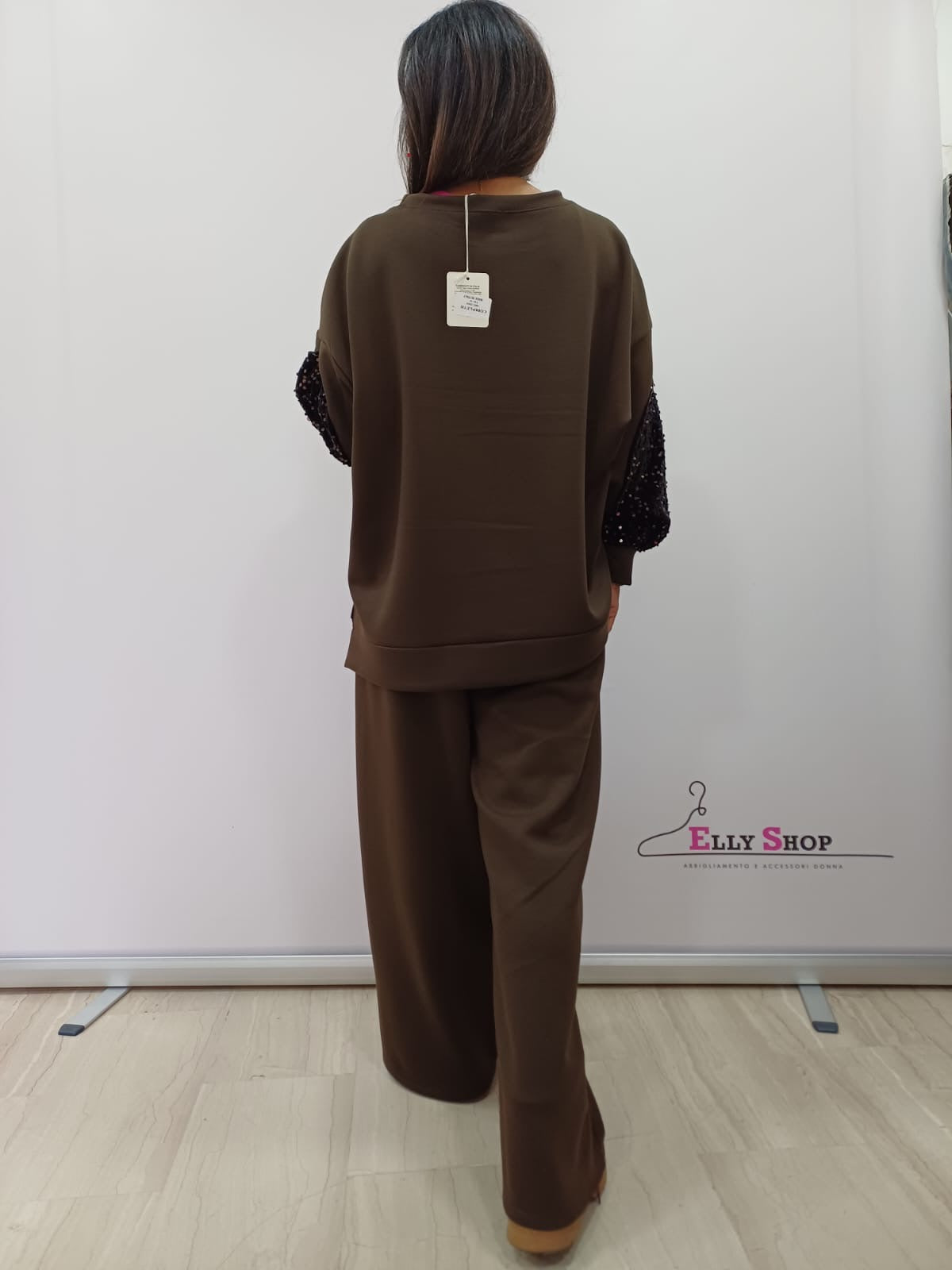 Dettaglio: Maniche con paillettes, scollo rotondo, pantalone a palazzo