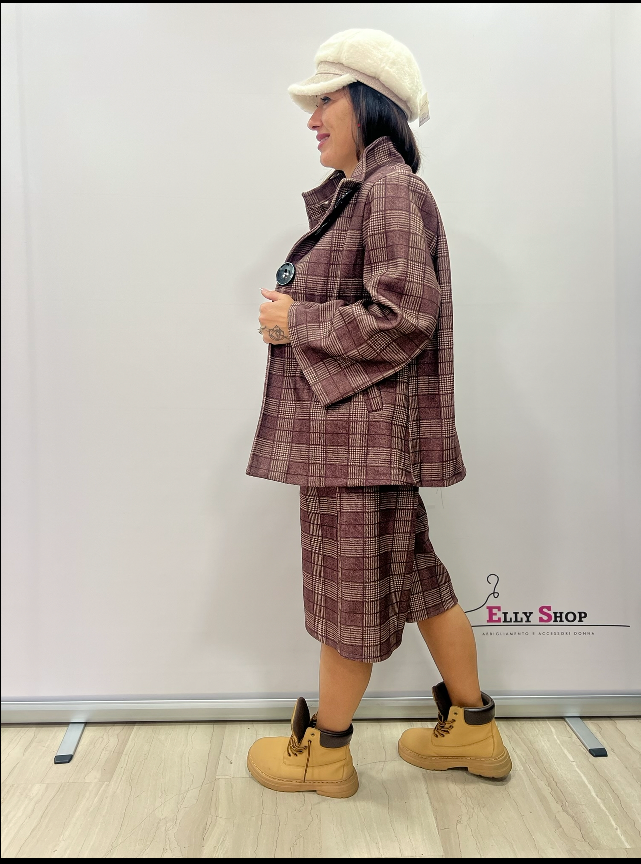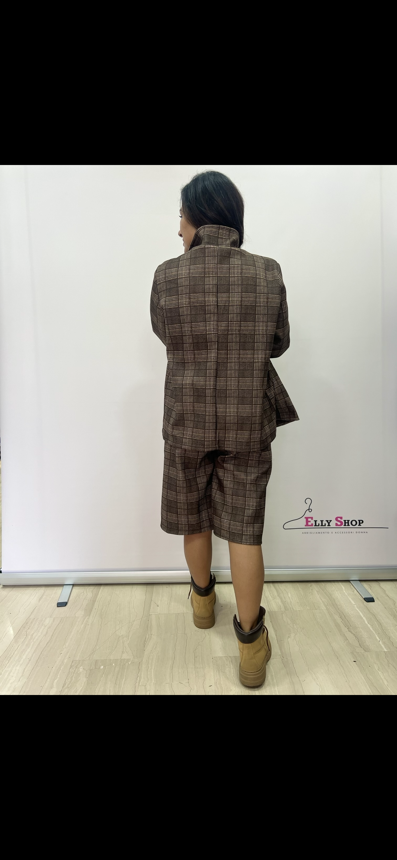 Completo donna dal design moderno e ricercato, caratterizzato da un elegante motivo a quadri sui toni del marrone. La giacca presenta una linea morbida e strutturata, con collo alto e maxi bottoni decorativi, ideale per look casual chic e per l’uso quotidiano. I bermuda coordinati offrono una vestibilità confortevole e dinamica, perfetti per chi desidera uno stile raffinato ma pratico. Disponibile in un’unica variante colore, si adatta bene a outfit da giorno e mezze stagioni. La modella indossa una 42 ed è alta 1,65 m.