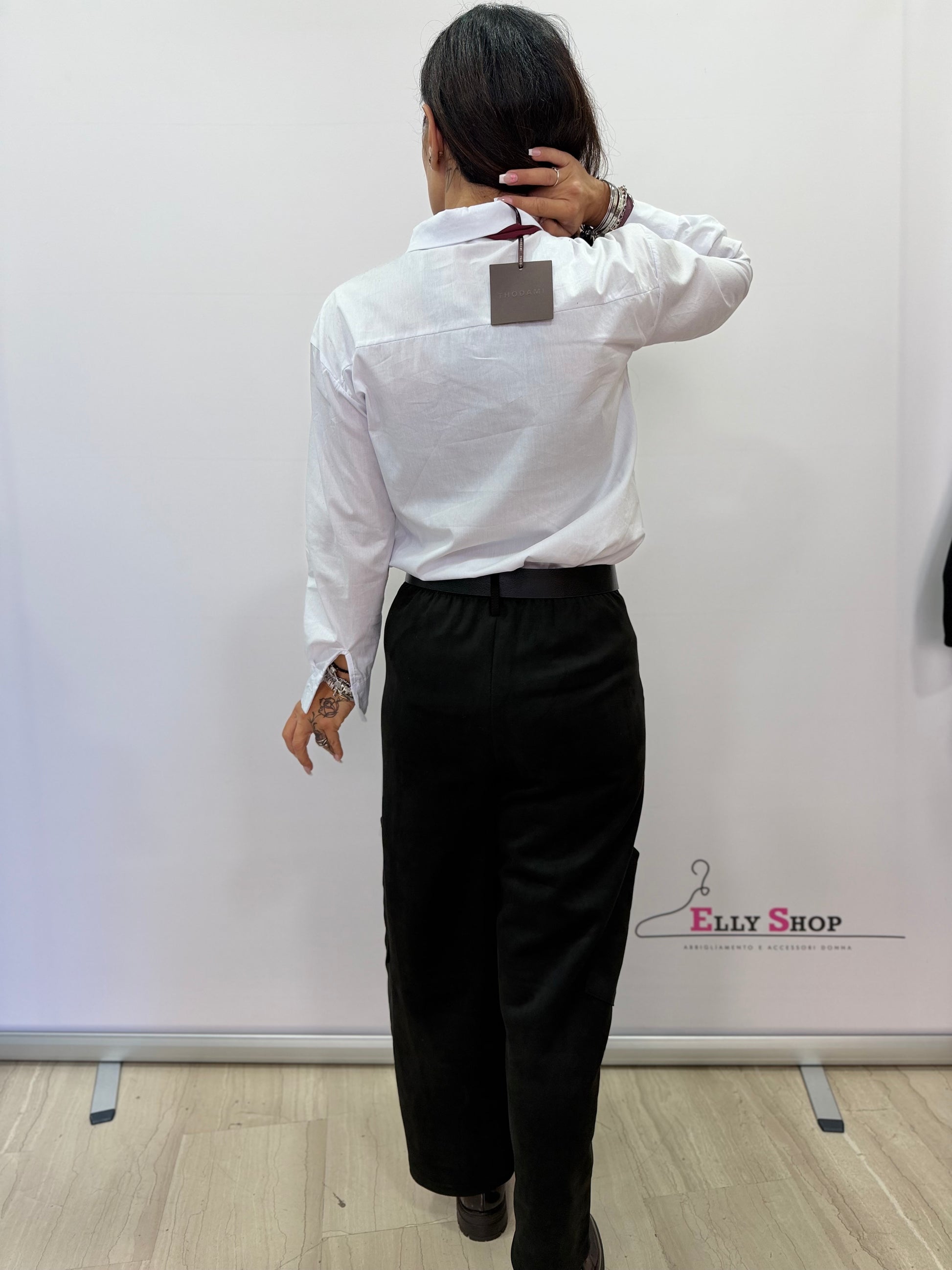 Completo dallo stile contemporaneo e deciso, composto da camicia bianca con colletto classico, cravatta coordinata e pantalone a vita alta dal taglio morbido. Un look che unisce eleganza e carattere, perfetto per un outfit da ufficio, eventi casual chic o serate urbane. Disponibile nella variante con pantalone marrone e cravatta marrone oppure con pantalone nero e cravatta bordeaux. La vestibilità è confortevole e versatile, adatta a diverse fisicità.