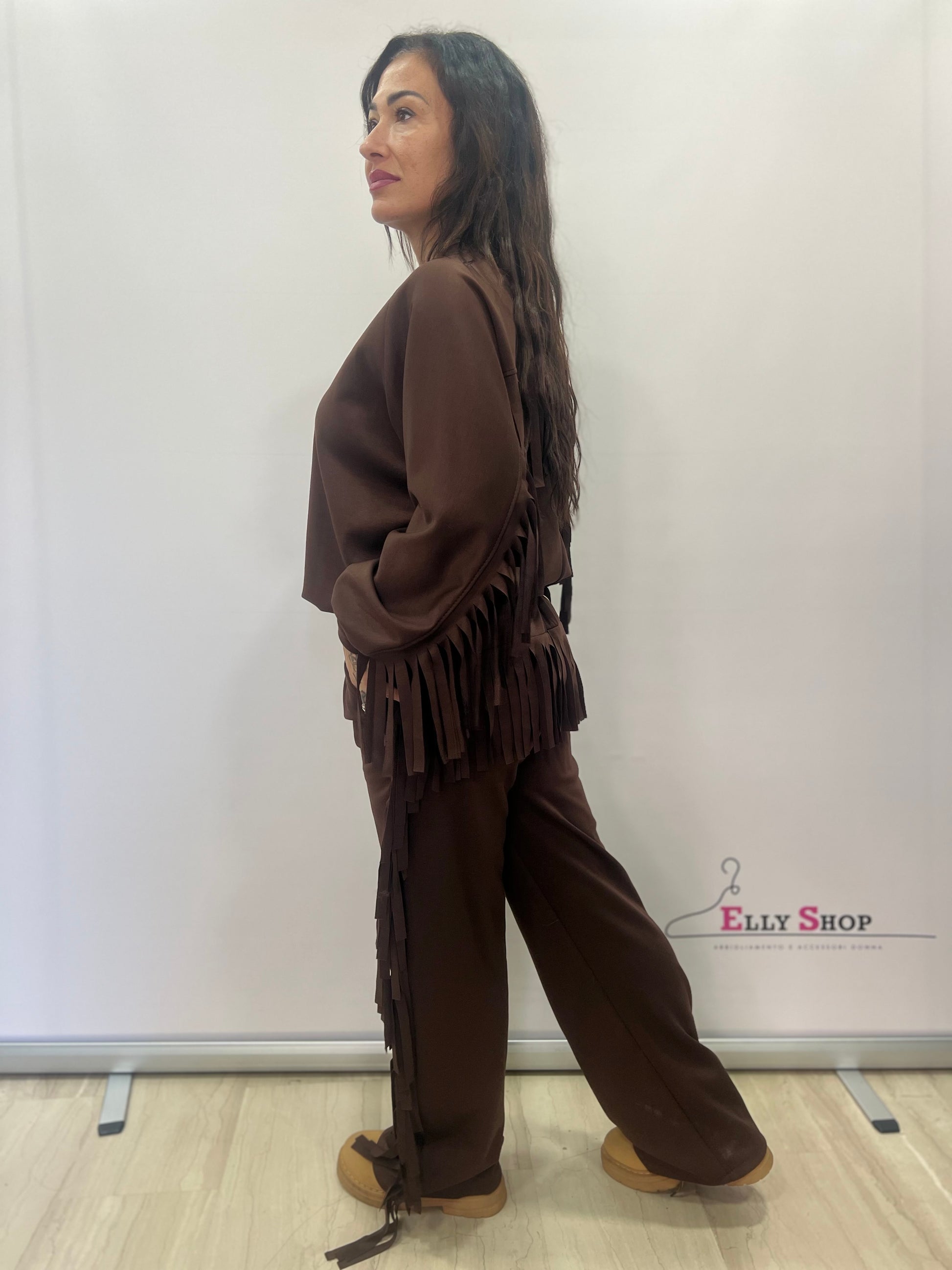 Dettaglio: Maglia a maniche lunghe con frange laterali e pantalone ampio con frange lungo la gamba