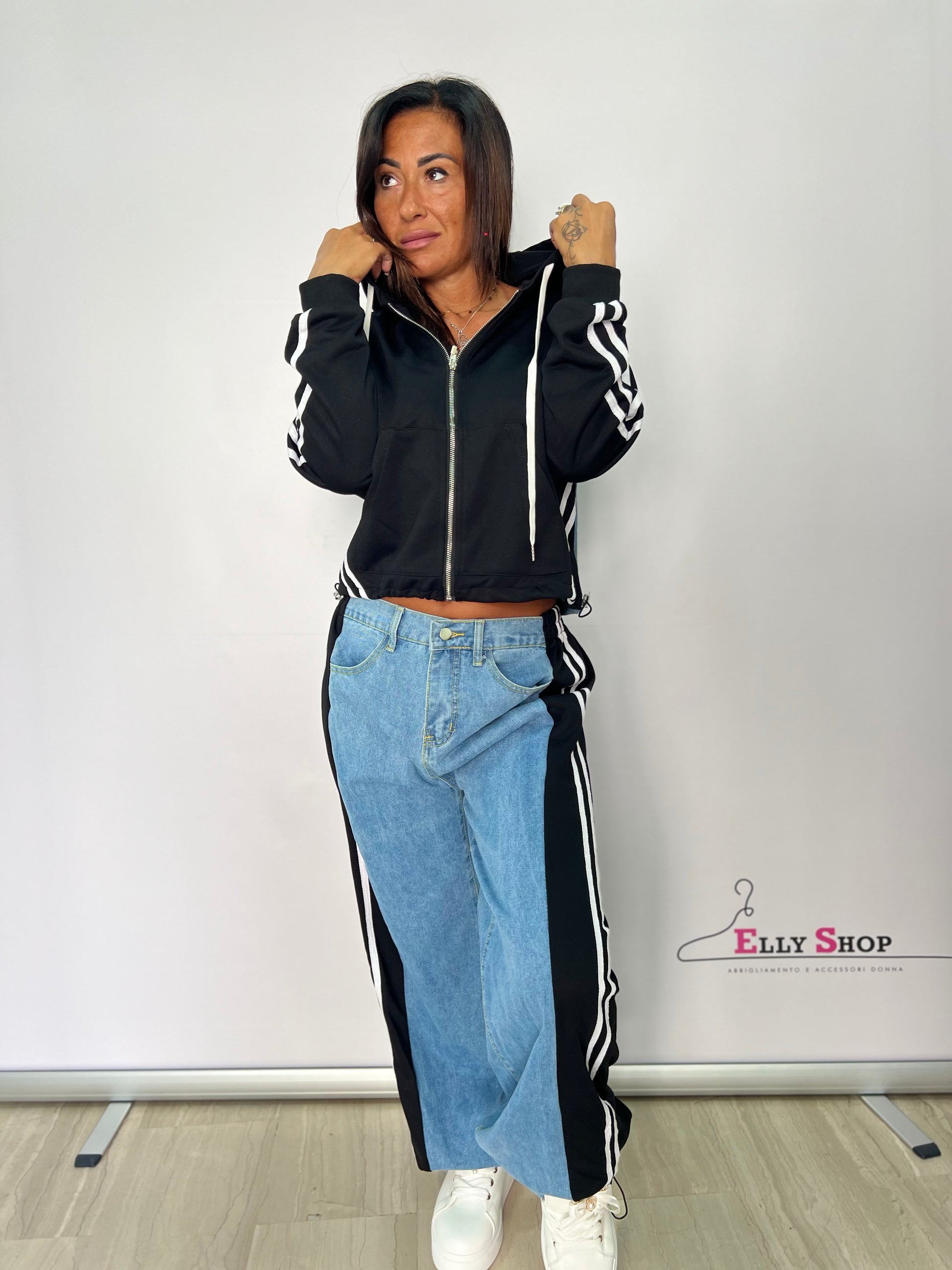 Completo donna sportivo con felpa e pantalone jeans – taglia unica grigia o nera fino a L