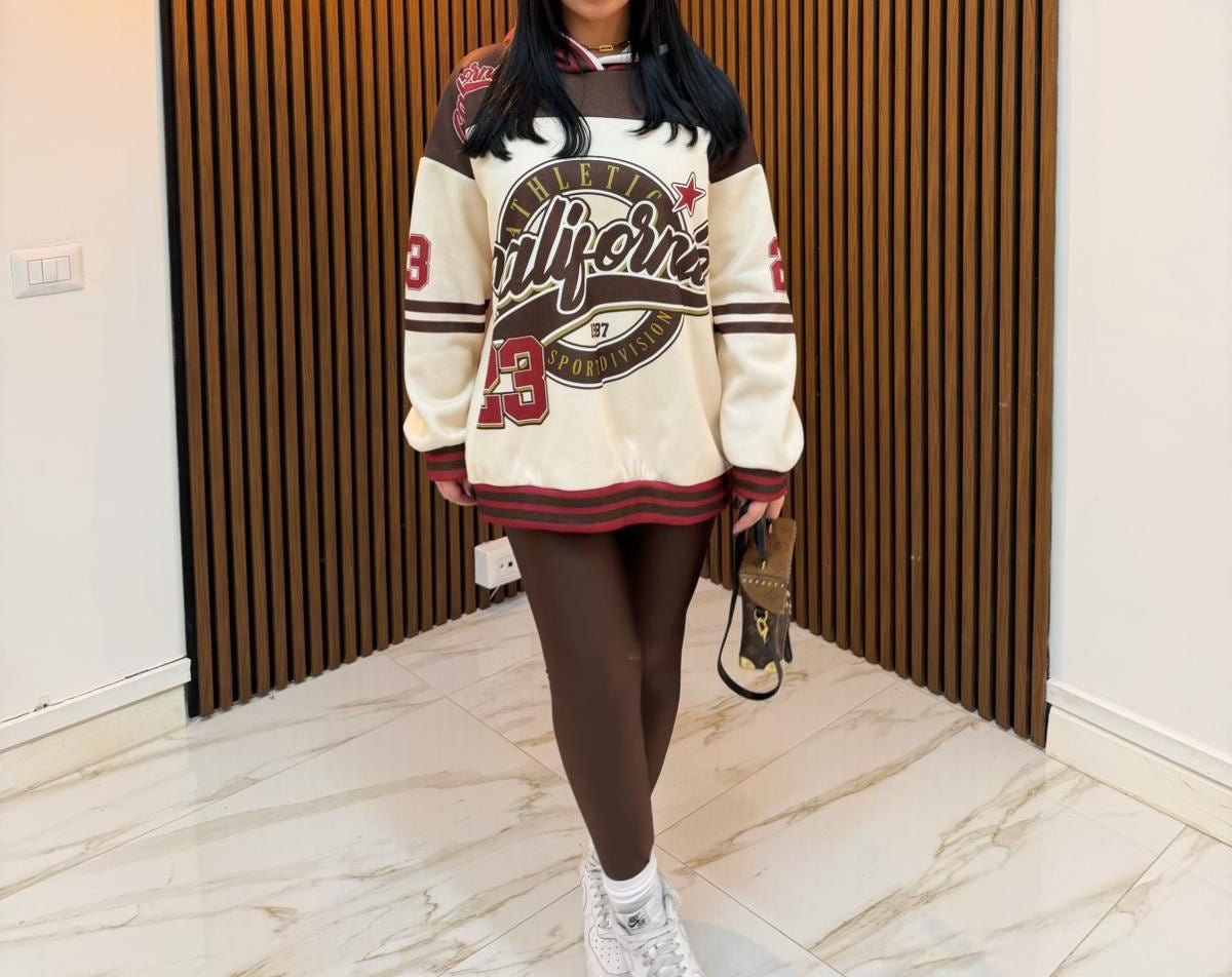 Un completo casual e di tendenza composto da felpa oversize con stampa frontale “California” e leggings coordinati. Perfetto per un look sportivo ma curato, ideale per il tempo libero, passeggiate o viaggi. La felpa morbida offre comfort e stile, mentre i leggings assicurano una vestibilità aderente e flessibile. Disponibile nei colori blu, bordeaux, nero e marrone, è un capo versatile che unisce praticità e carattere urbano.
