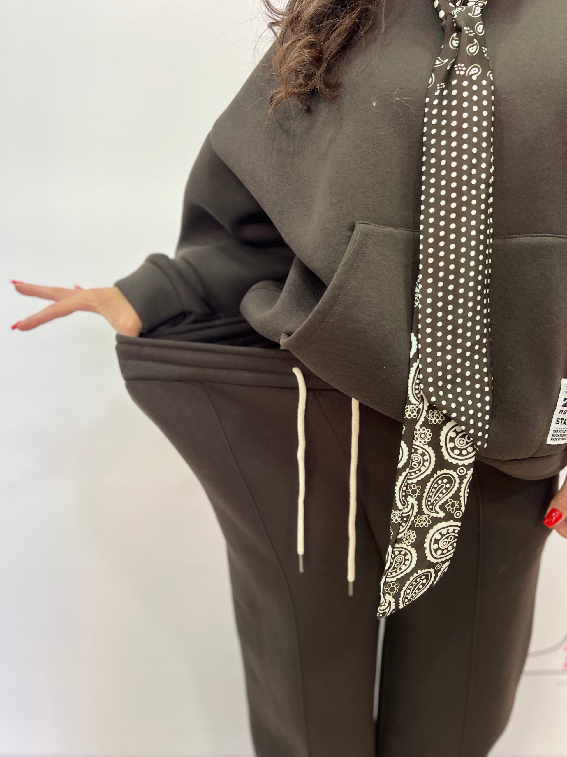 Completo donna dallo stile casual e contemporaneo, ideale per il tempo libero, viaggi e look quotidiani comodi ma curati. La felpa con cappuccio presenta una linea morbida e avvolgente, impreziosita dal foulard decorativo integrato che dona un tocco originale e ricercato. Il pantalone coordinato garantisce comfort e libertà di movimento, valorizzando le forme senza costringere. Un completo versatile, perfetto per un outfit rilassato ma di tendenza. Disponibile in colore nero e marrone.