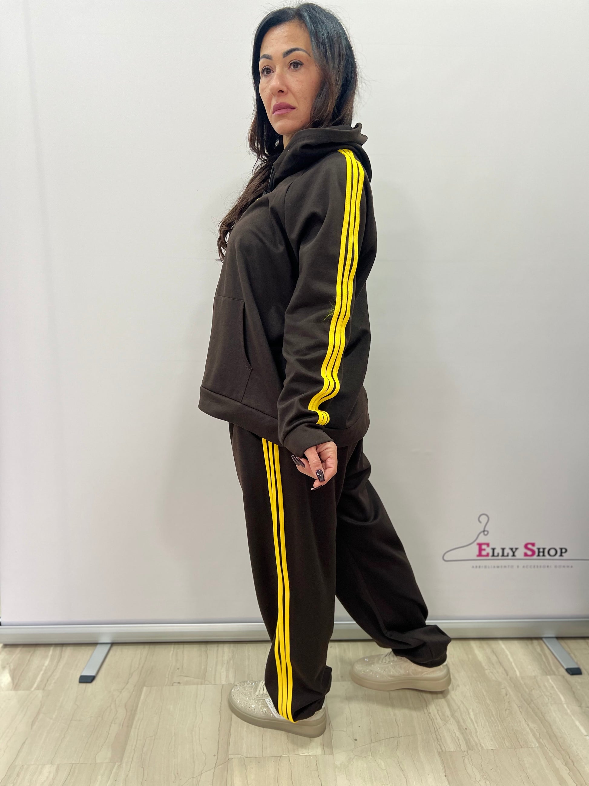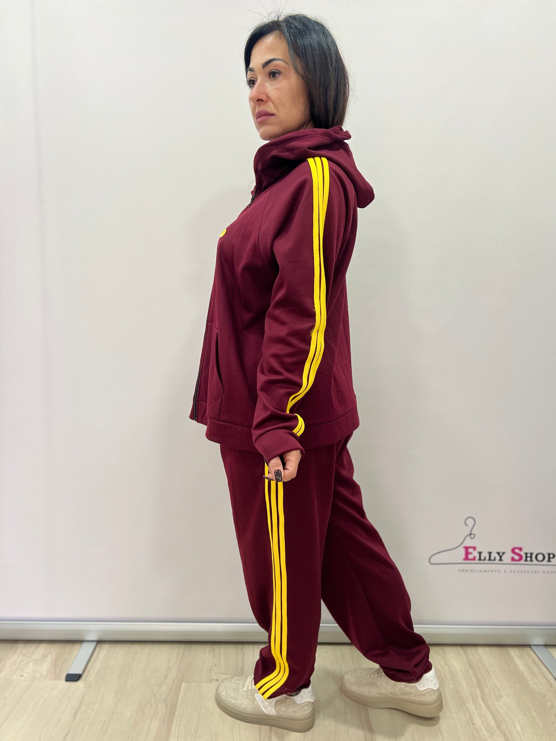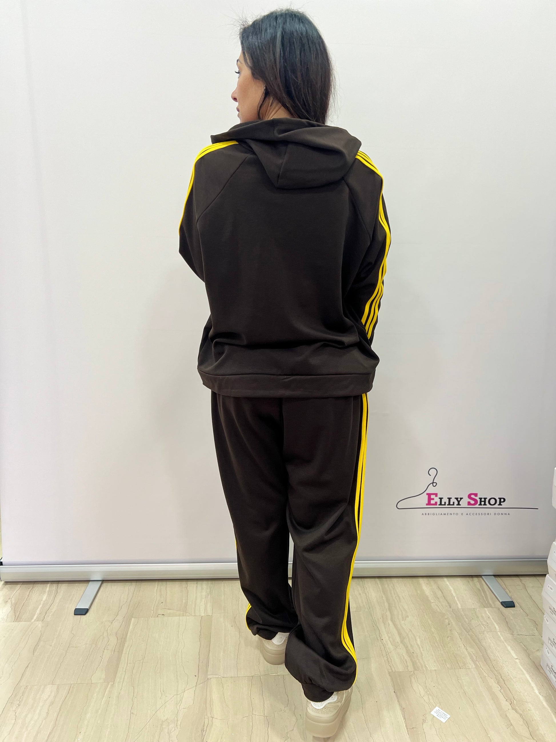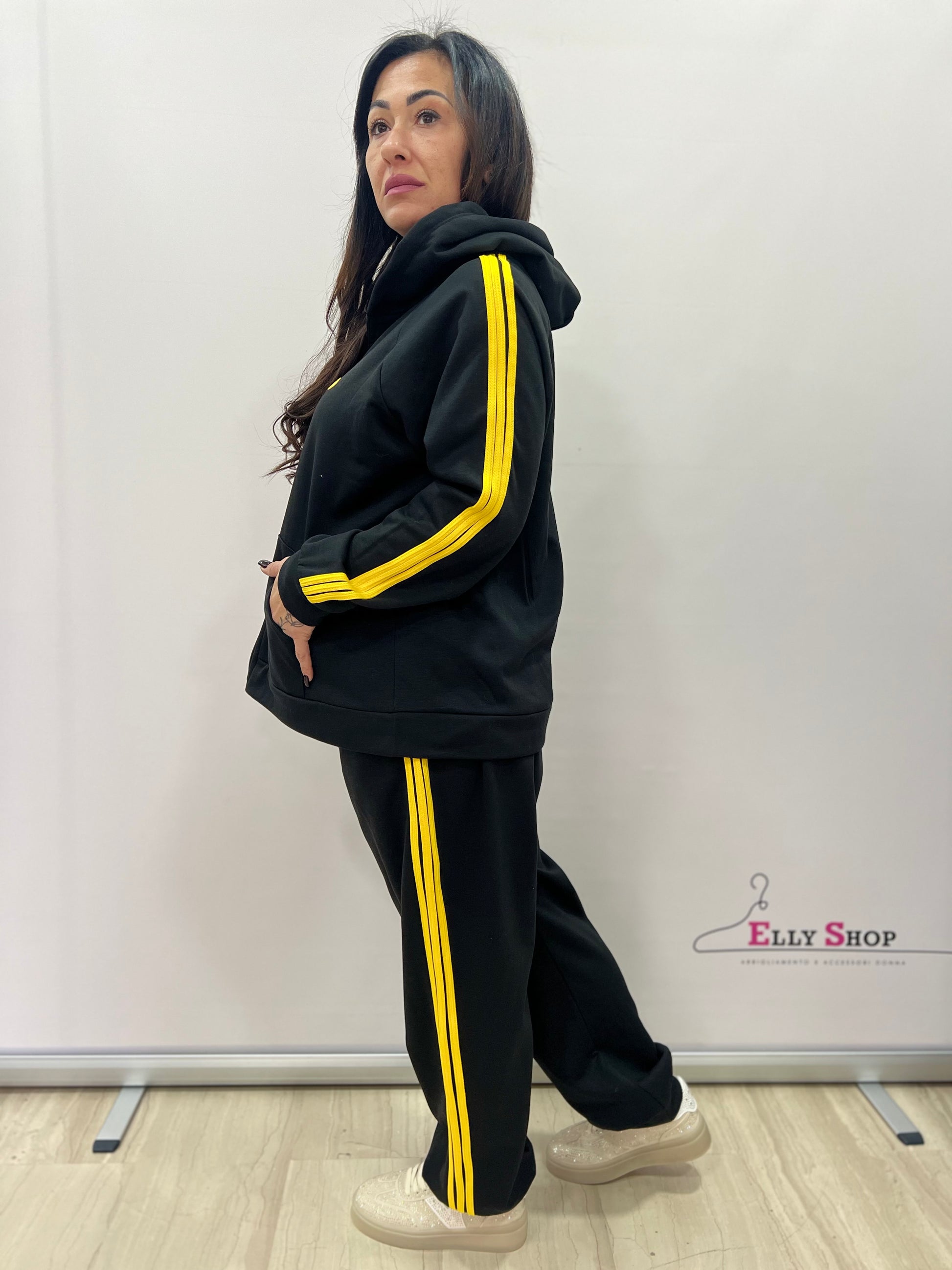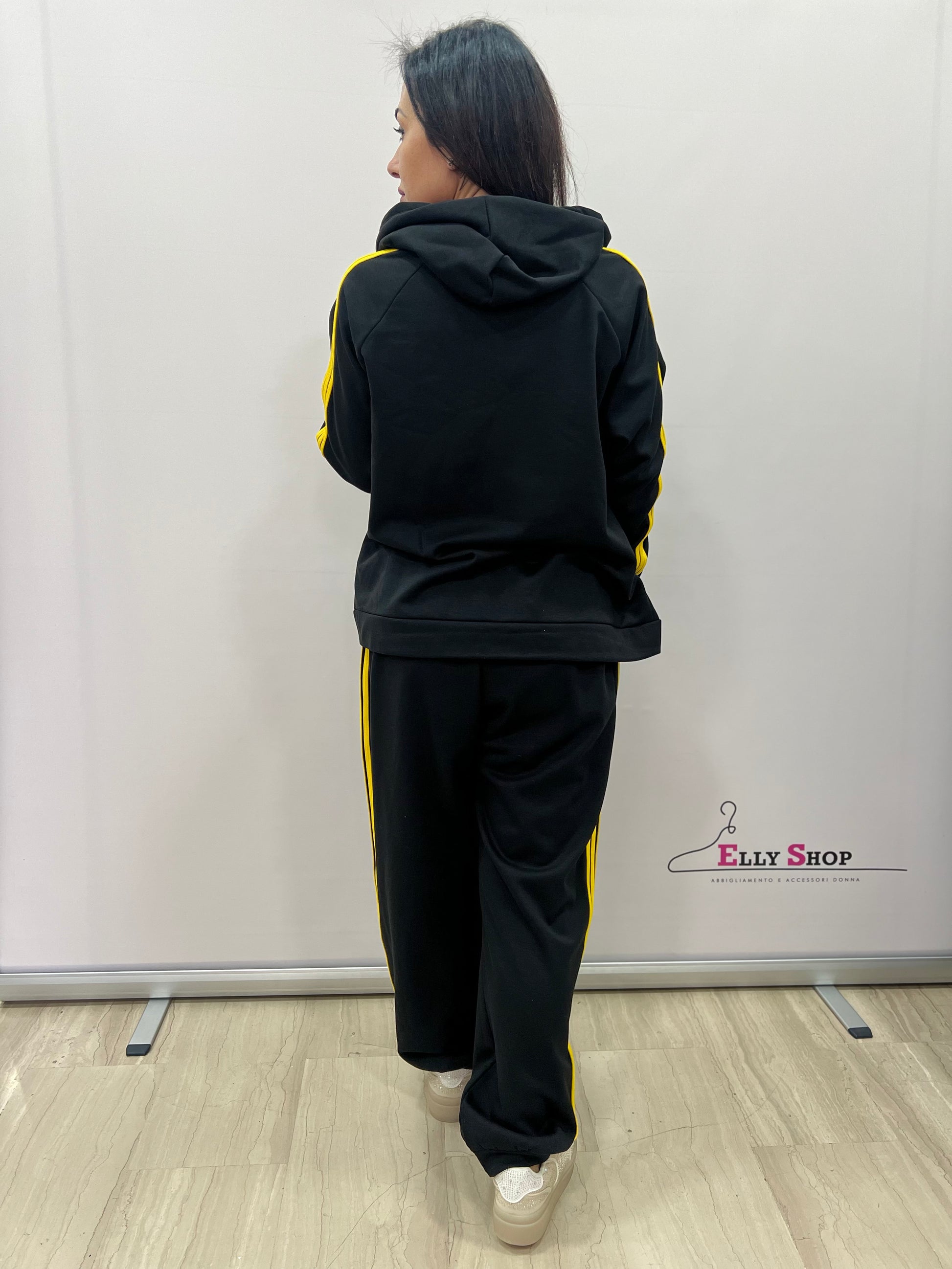 Dettaglio: Felpa con cappuccio e chiusura zip, tasche frontali, pantalone con elastico in vita e bande laterali a contrasto