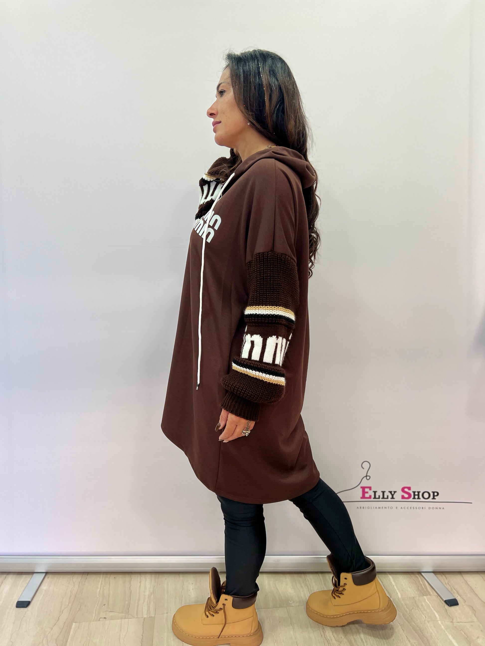 Felpa lunga curvy con cappuccio e maniche a maglia