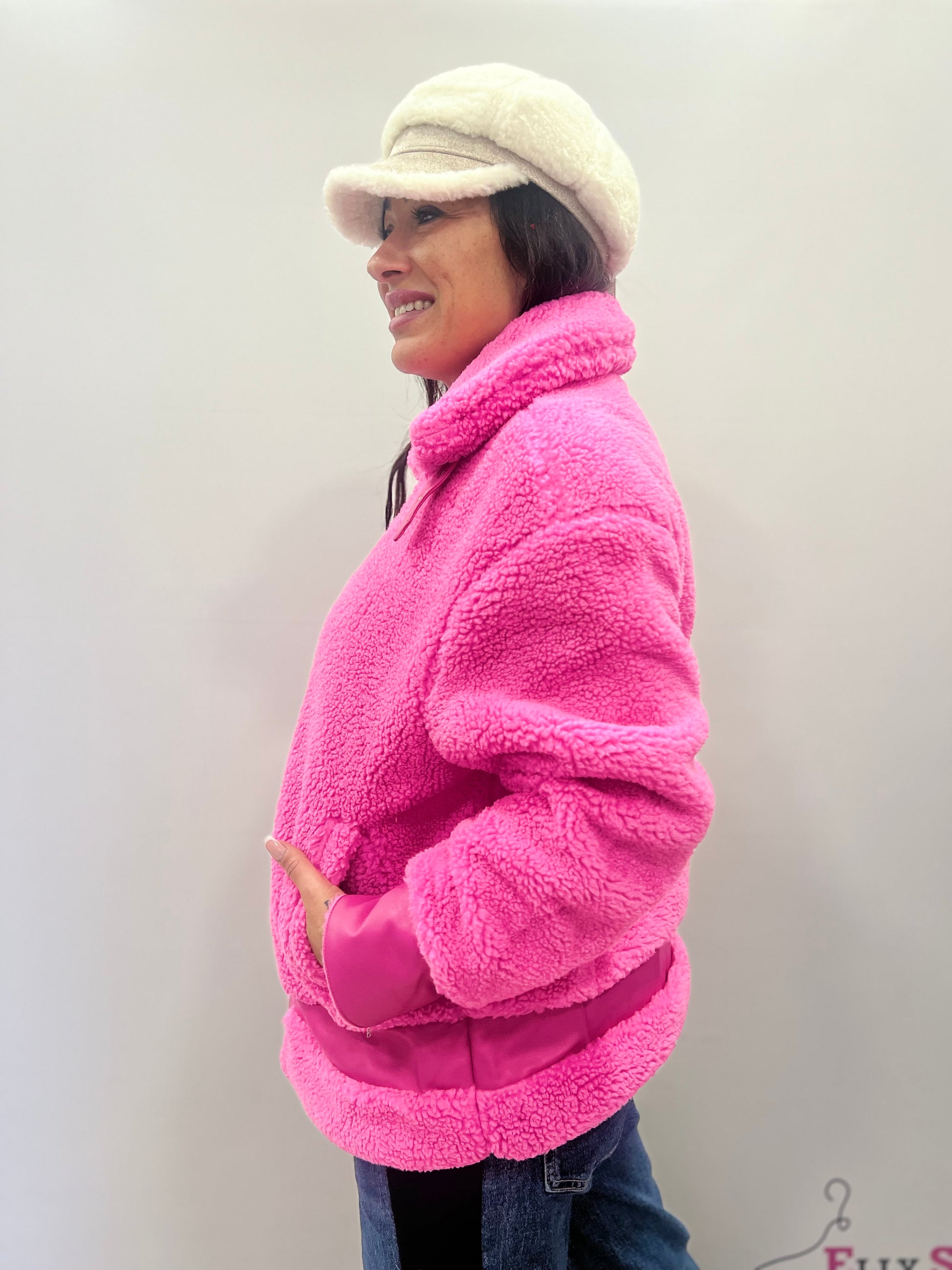 Giacca teddy morbida, calda e avvolgente, ideale per la stagione fredda e perfetta per look casual, streetwear e quotidiani. Il design è arricchito da inserti in ecopelle che donano carattere e modernità al capo, mentre il colletto alto con cinturini aggiunge un tocco grintoso e contemporaneo. La vestibilità è comoda e leggermente over, garantendo comfort senza rinunciare allo stile. Disponibile in quattro varianti colore: nero, panna, bianco con dettagli neri e fucsia.