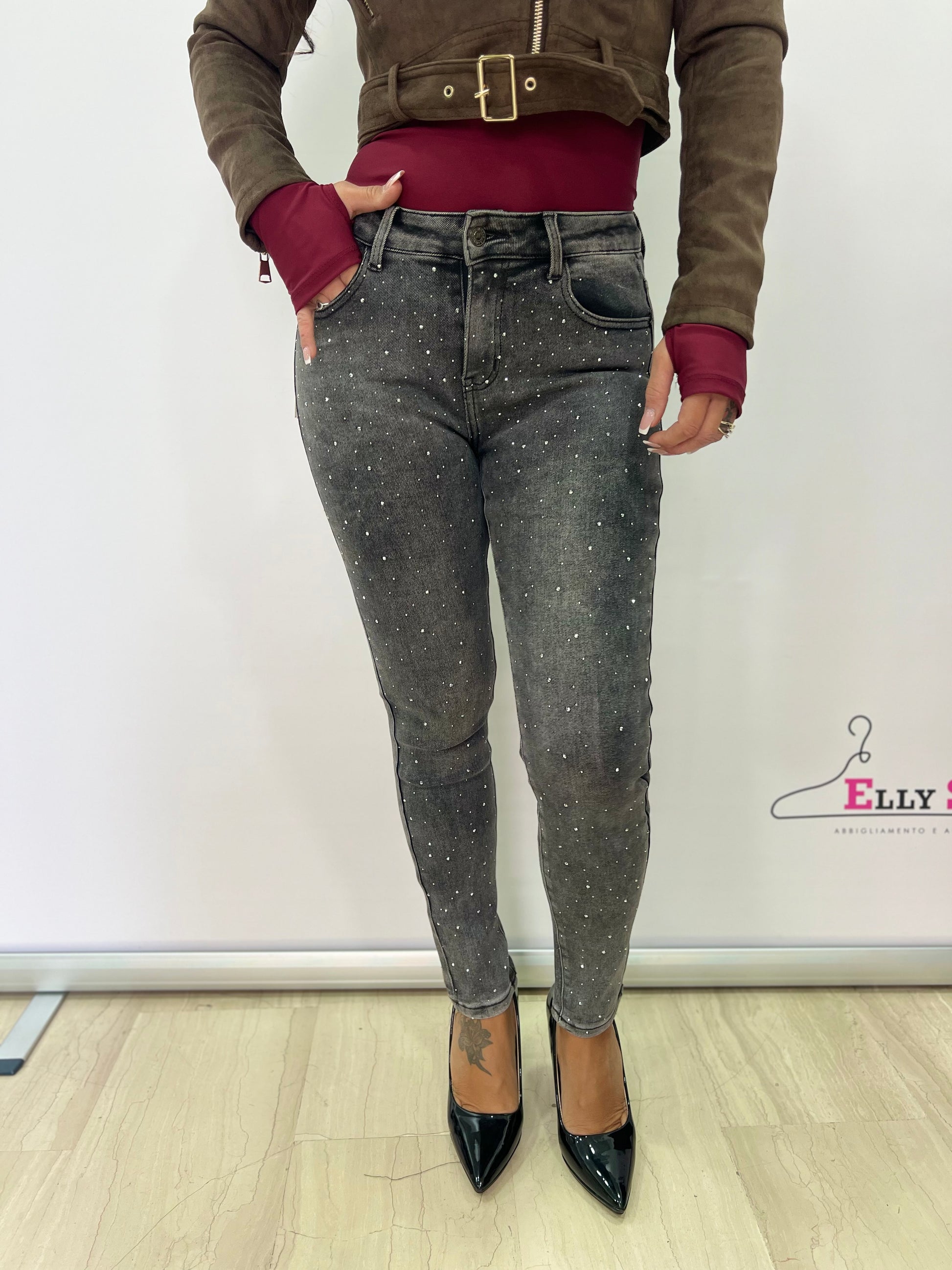 Jeans skinny dal carattere glamour e moderno, realizzati in denim grigio effetto washed e impreziositi da micro strass distribuiti sul davanti e lungo i lati. La linea aderente valorizza la silhouette senza rinunciare al comfort, grazie alla morbida elasticità del tessuto. Perfetti per outfit casual-chic, serate, aperitivi o per aggiungere un tocco luminoso a un look quotidiano. Ideali da abbinare a décolleté, stivaletti o sneakers per un effetto sempre femminile e curato.