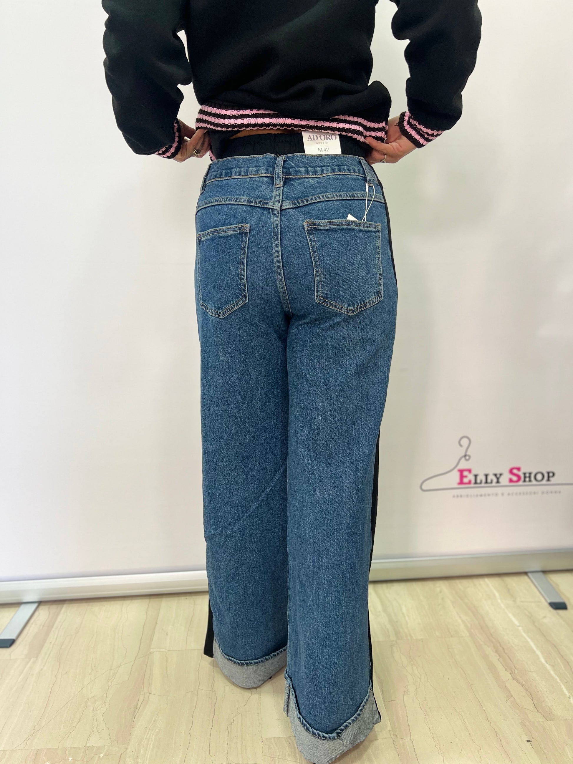 Jeans dal design moderno e originale, caratterizzati da una linea wide leg che dona un effetto slanciato e una vestibilità comoda. Il dettaglio distintivo è la banda laterale nera in tessuto morbido, che crea un contrasto elegante e dinamico, perfetto per look casual ma ricercati. Il fondo risvoltato aggiunge un tocco trendy, mentre la vita regolare con elastico posteriore assicura massimo comfort e adattabilità. Ideali per completare outfit quotidiani, streetwear o per dare personalità a un look semplice.