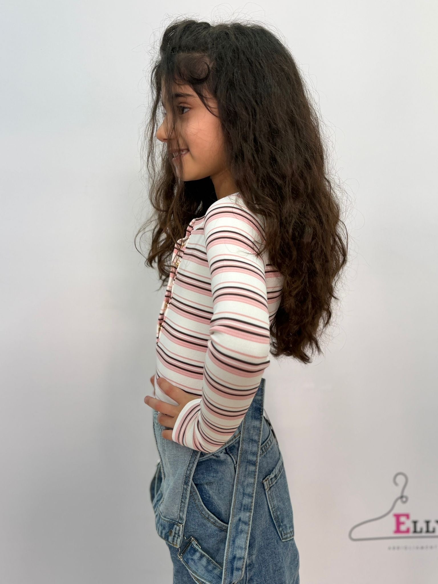 Maglia a manica lunga dal design semplice e moderno, perfetta per creare outfit casual e versatili per ogni giorno. Il modello aderente valorizza la silhouette mantenendo comfort e libertà di movimento. La fantasia a righe nei toni del rosa, bianco e nero dona un tocco delicato e alla moda, mentre i piccoli bottoni decorativi sul davanti aggiungono un dettaglio raffinato. Ideale da abbinare a jeans, salopette o gonne per look pratici e sempre curati, adatta alla scuola, al tempo libero e alle uscite quotidiane.