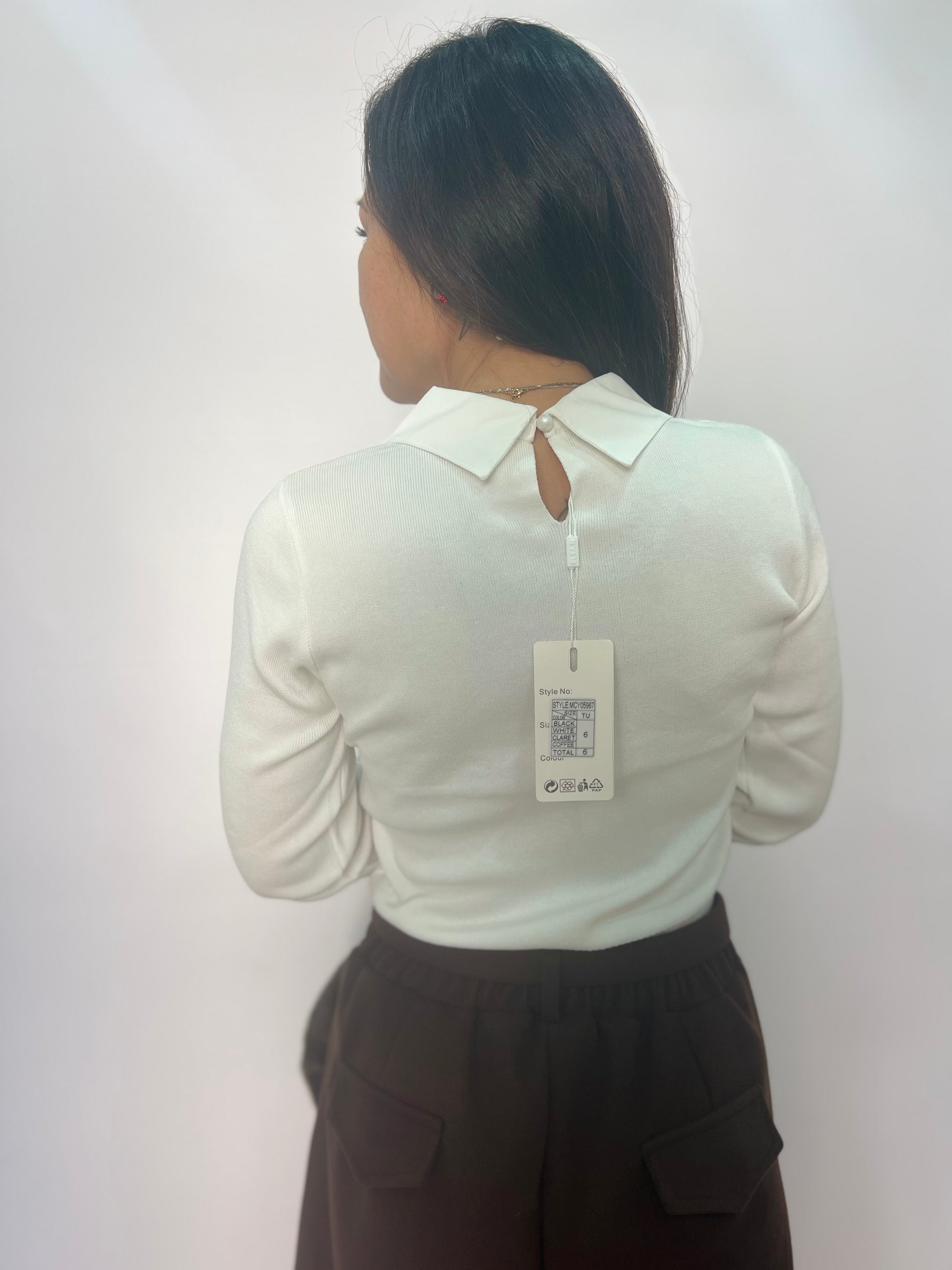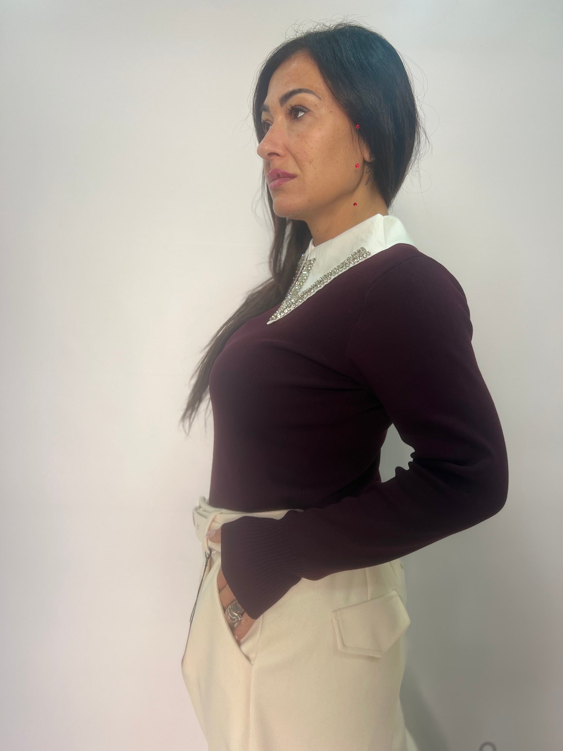 Maglia elegante e femminile caratterizzata da un colletto bianco a punta impreziosito da applicazioni gioiello, pensato per aggiungere un tocco luminoso e sofisticato a qualsiasi outfit. La linea è aderente ma confortevole, perfetta per valorizzare la silhouette senza rinunciare alla praticità. Ideale per look da ufficio, serate o occasioni speciali, è disponibile in tre varianti colore: bianco, panna e bordeaux.