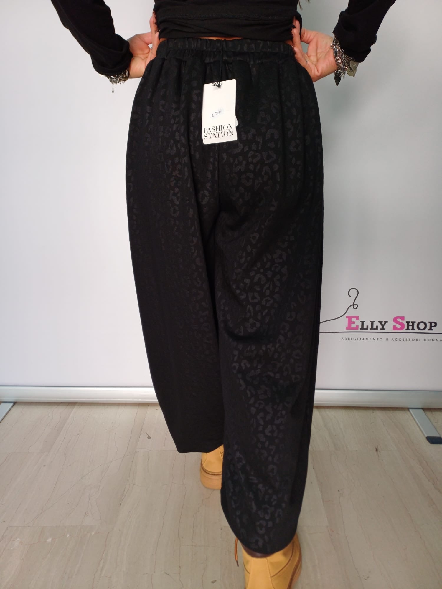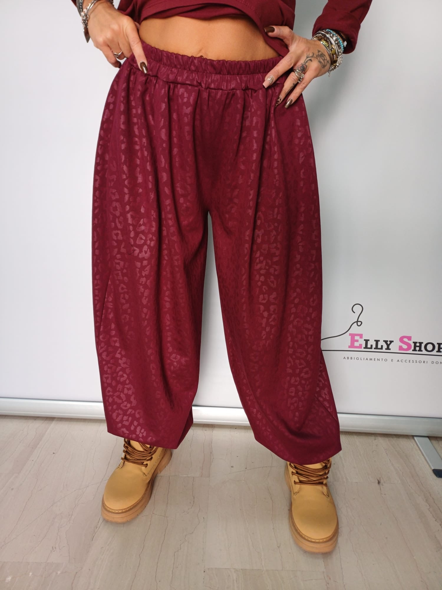 Pantalone dallo stile contemporaneo e confortevole, caratterizzato da una linea ampia e morbida che garantisce libertà di movimento e una vestibilità versatile. Il design con elastico in vita assicura comfort e adattabilità, mentre il motivo tono su tono aggiunge un tocco sofisticato e discreto. Perfetto per look casual chic, si abbina facilmente a bluse, maglie o cardigan. Disponibile nei colori nero, bordeaux e marrone, è un capo ideale per la stagione autunnale e invernale.