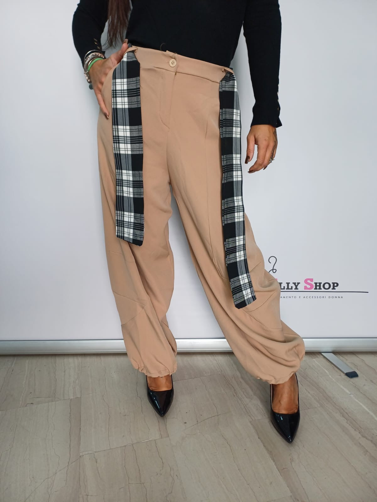 Pantalone donna dal design originale e contemporaneo, perfetto per chi ama distinguersi con stile. Il modello presenta gamba ampia con fondo leggermente arricciato e bretelle decorative a fantasia scozzese, che donano un tocco trendy e sofisticato al look. Ideale per outfit casual chic, da abbinare con maglie a tinta unita o camicie morbide per un effetto moderno e ricercato. Disponibile nei colori bordeaux, nero, marrone e beige.