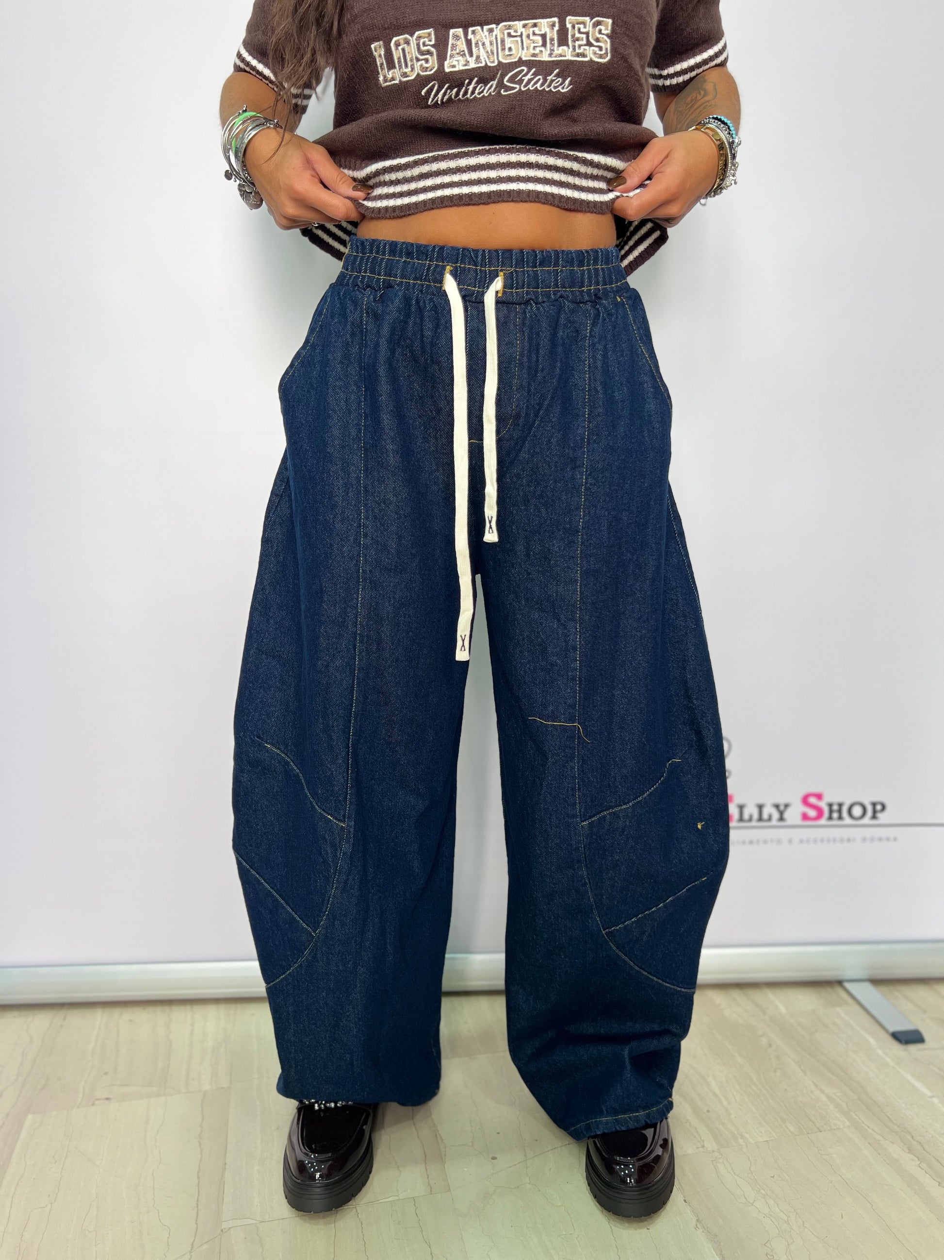 Questo pantalone in denim con molla in vita balloon è un'ottima scelta per un look casual ma elegante. La morbida vita a molla garantisce un comfort ottimale, mentre il taglio a palloncino aggiunge un tocco di originalità al tuo outfit. Perfetto per un'occasione informale o una giornata in città.