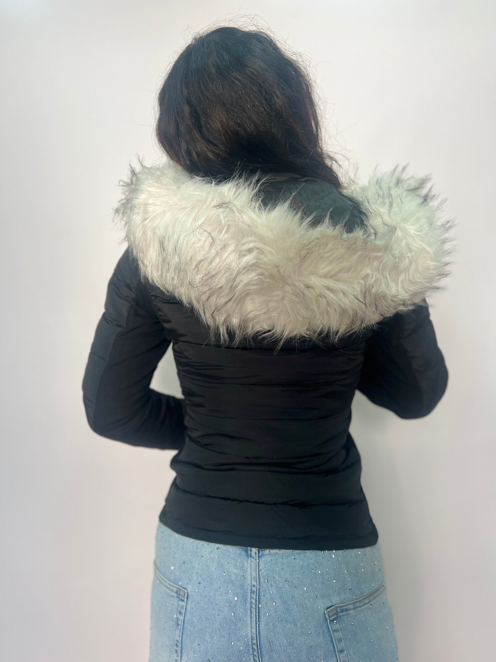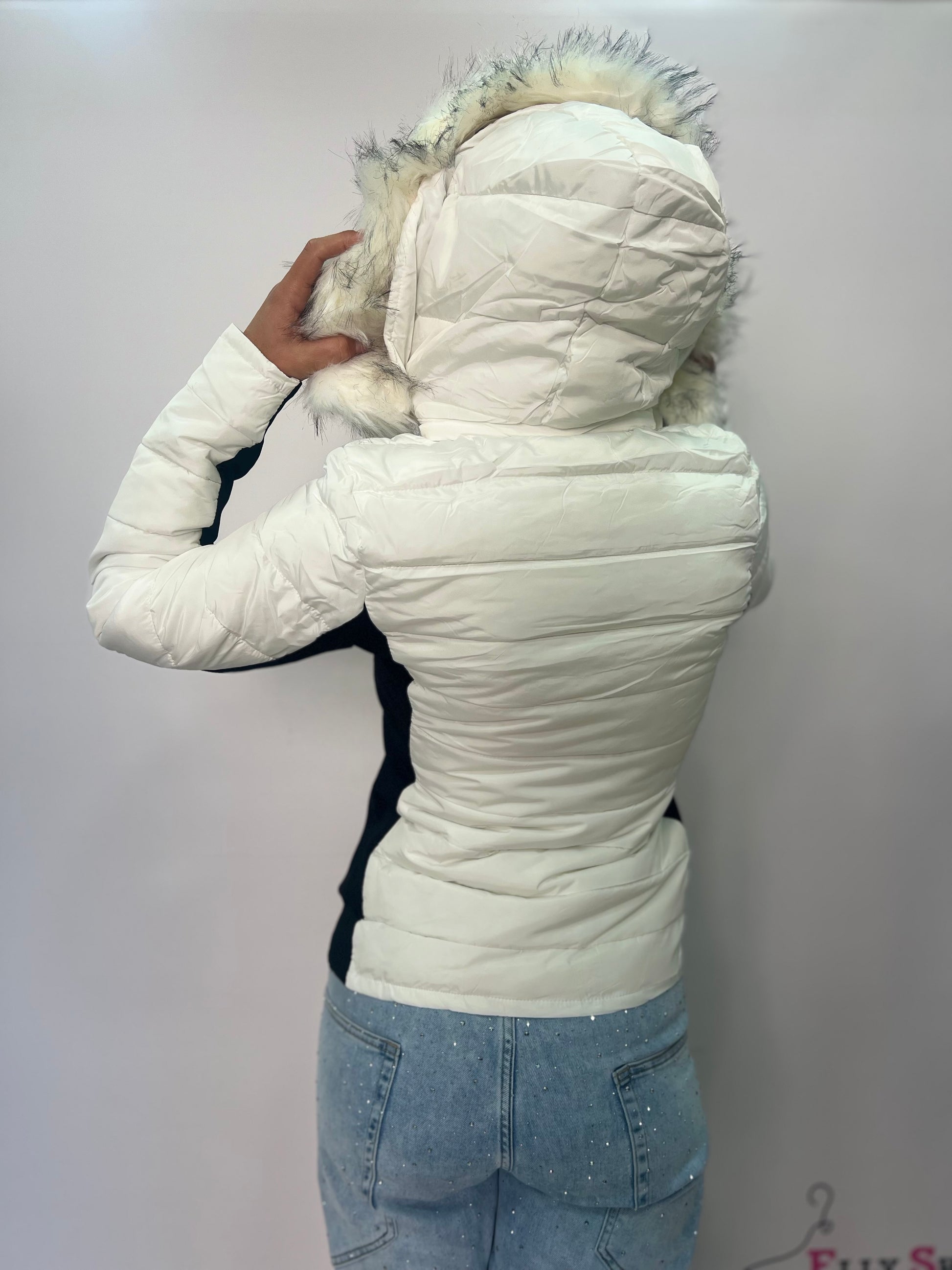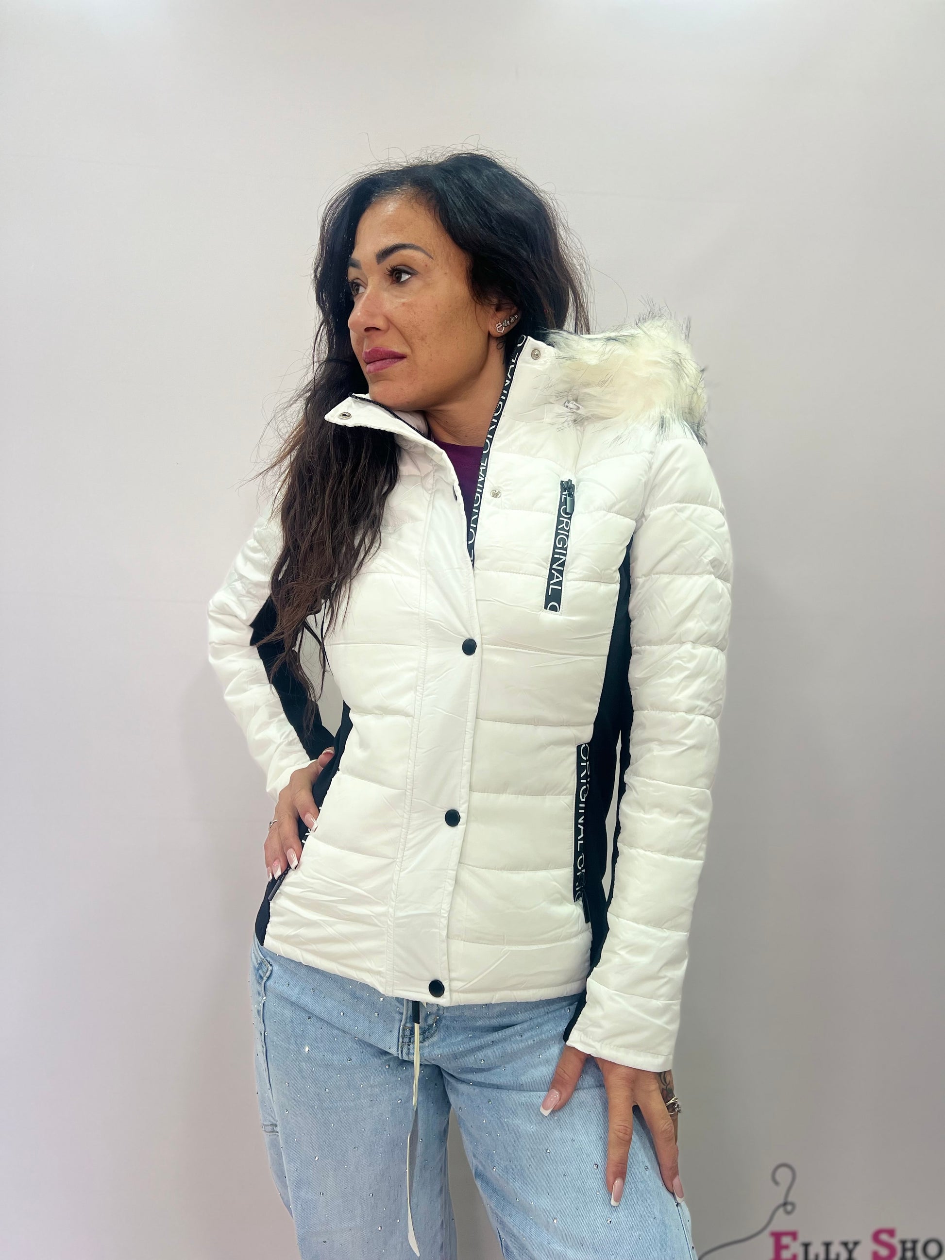 Dettaglio: Cappuccio con ecopelliccia, chiusura con zip e bottoni, inserti laterali elasticizzati a contrasto