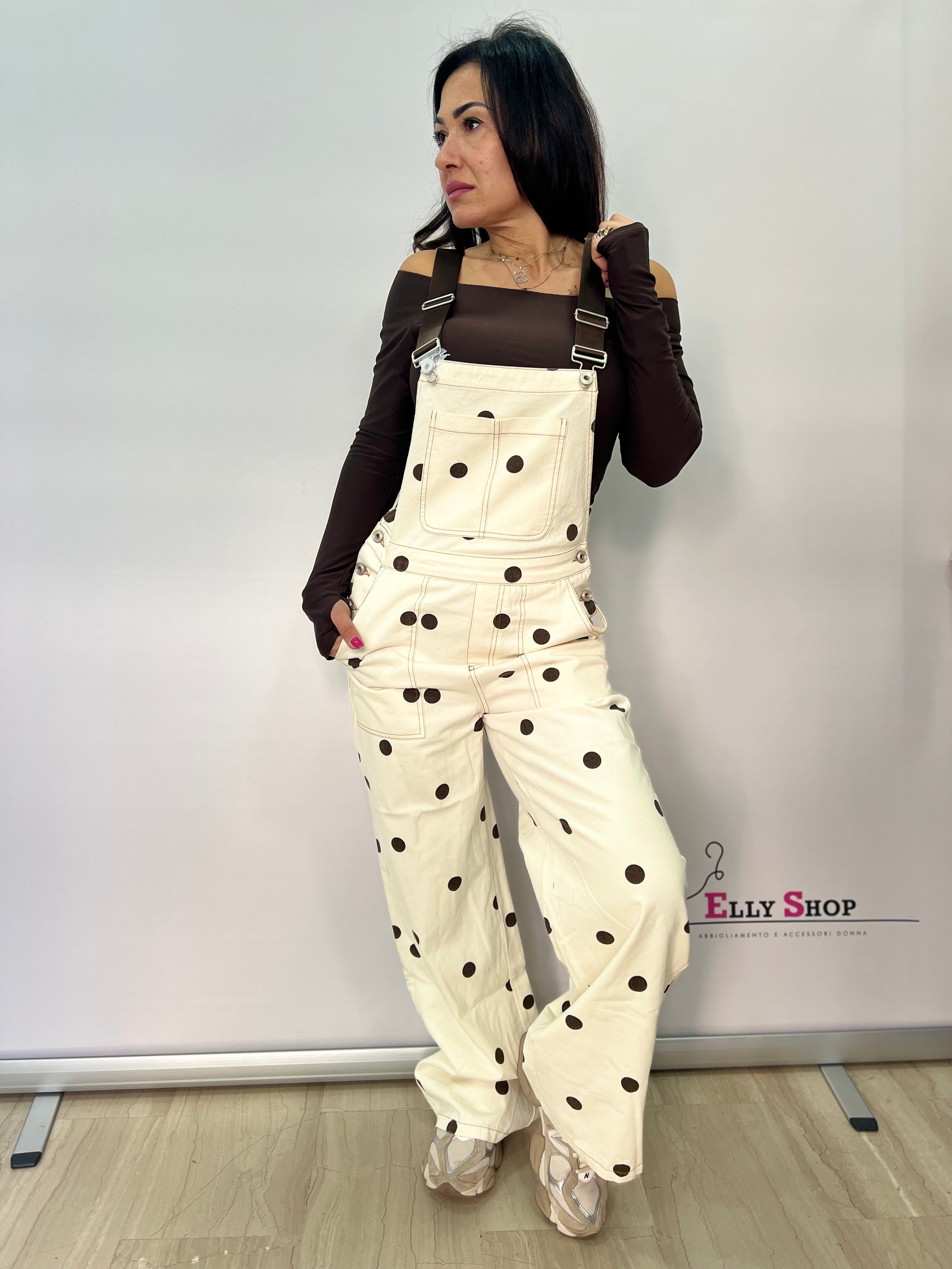 Salopette dal design originale e di tendenza, perfetta per chi ama distinguersi con uno stile casual ma ricercato. Il modello presenta una linea ampia e fluida con gamba wide leg, arricchita da una stampa a pois che dona un tocco giocoso e femminile. Le bretelle regolabili e la struttura con pettorina valorizzano la silhouette mantenendo comfort e praticità. Ideale per il tempo libero, outfit giornalieri o look urban chic. Disponibile nella variante panna con pois neri, facilmente abbinabile a top e body per creare combinazioni versatili.