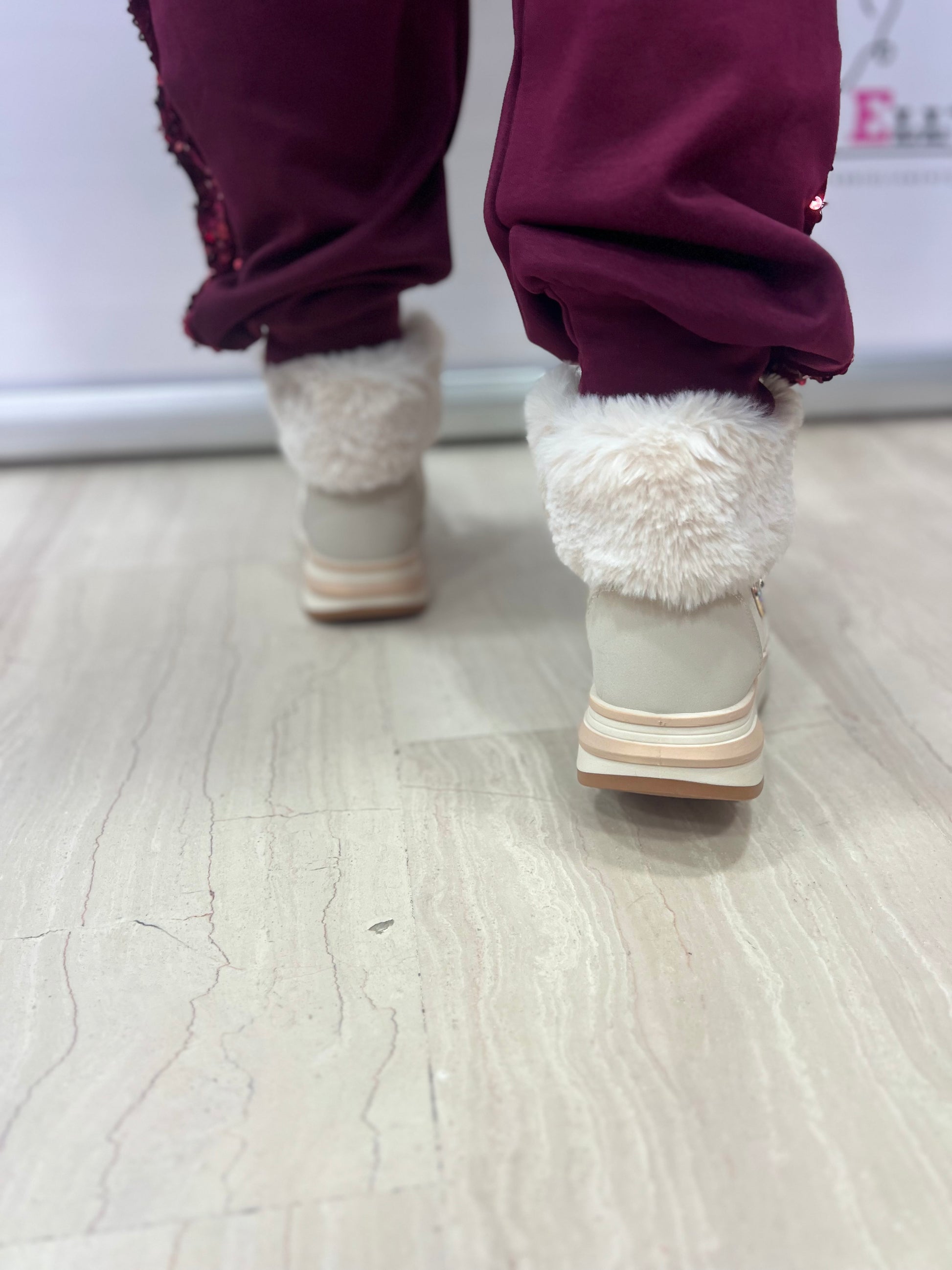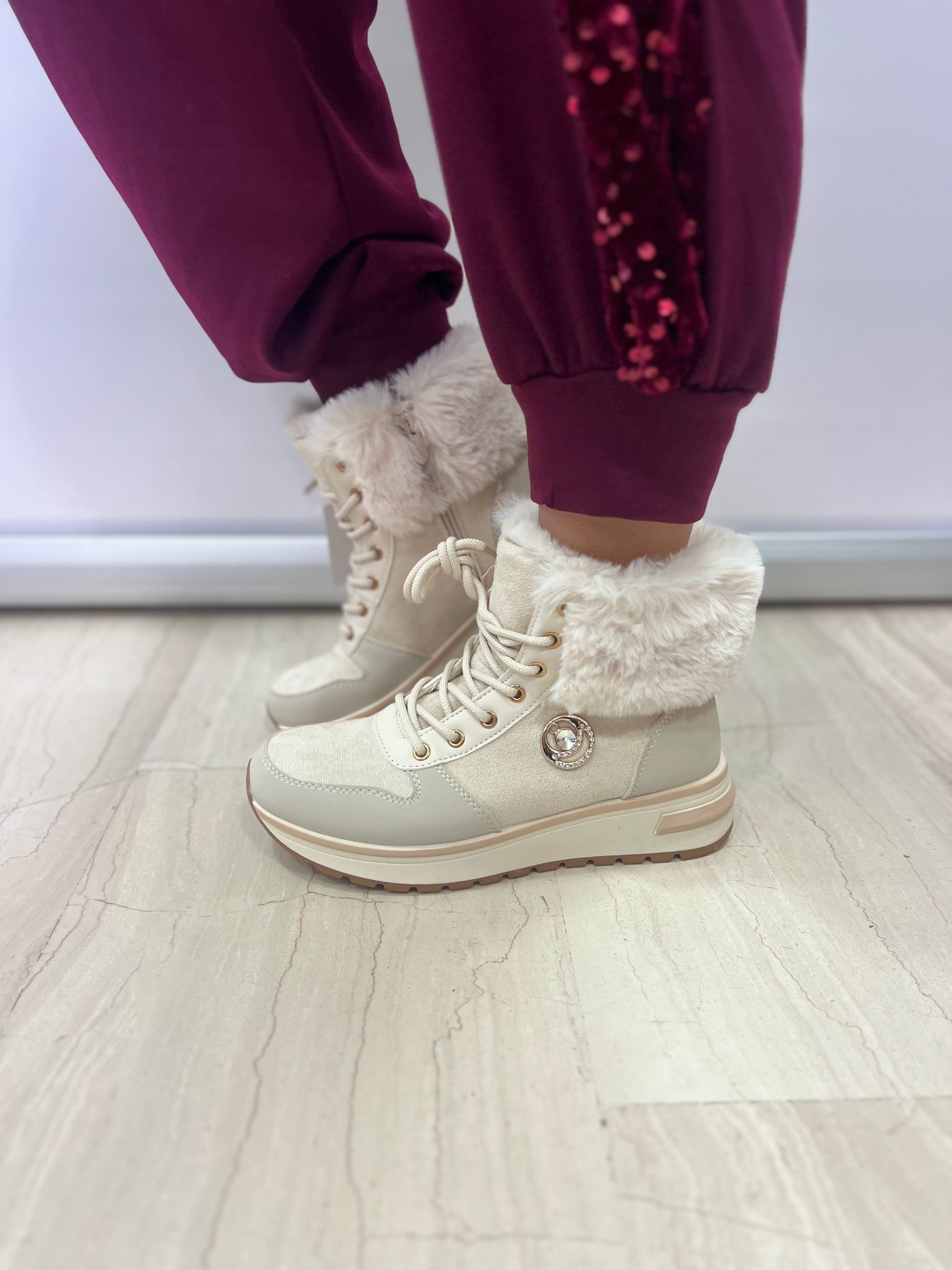 Stivaletti invernali dal design caldo e accogliente, ideali per affrontare la stagione fredda con stile e comodità. Il bordo in morbida pelliccia ecologica dona un aspetto elegante e raffinato, mentre la struttura robusta garantisce stabilità e comfort anche durante le giornate più dinamiche. Perfetti per look casual, sportivi o per un tocco chic nei vostri outfit quotidiani. Disponibili in una versatile tonalità panna, facilmente abbinabile.