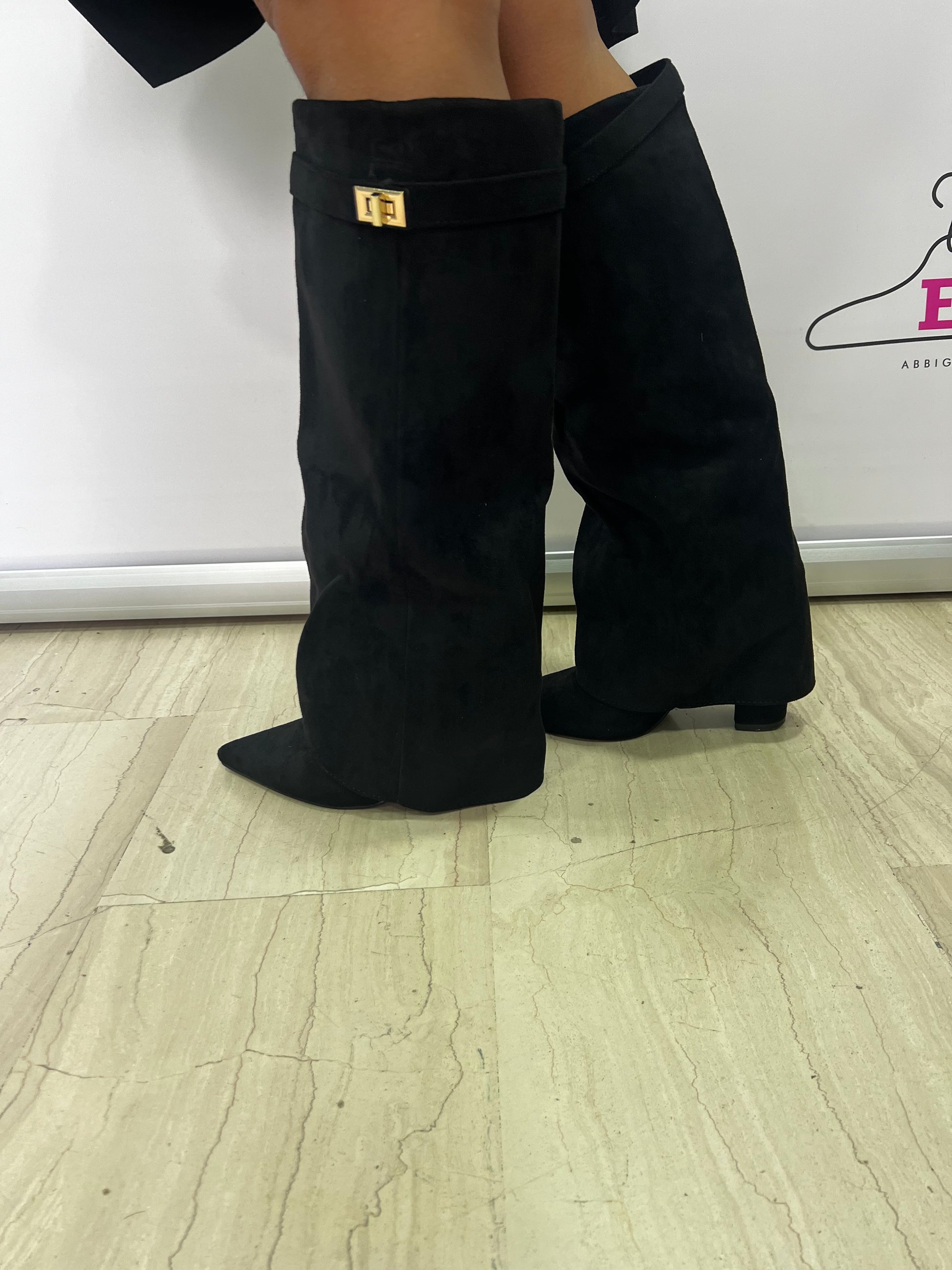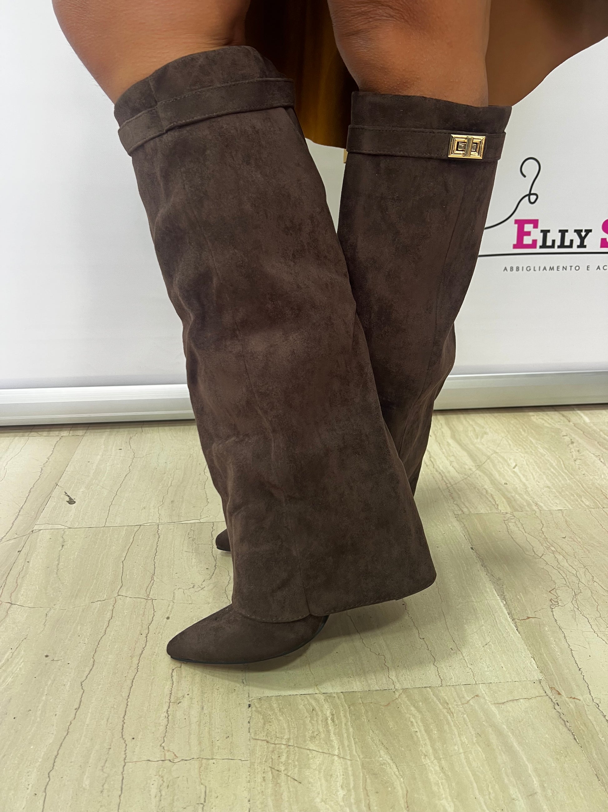 Dettaglio: Modello sotto il ginocchio con punta affusolata e decorazione metallica dorata laterale