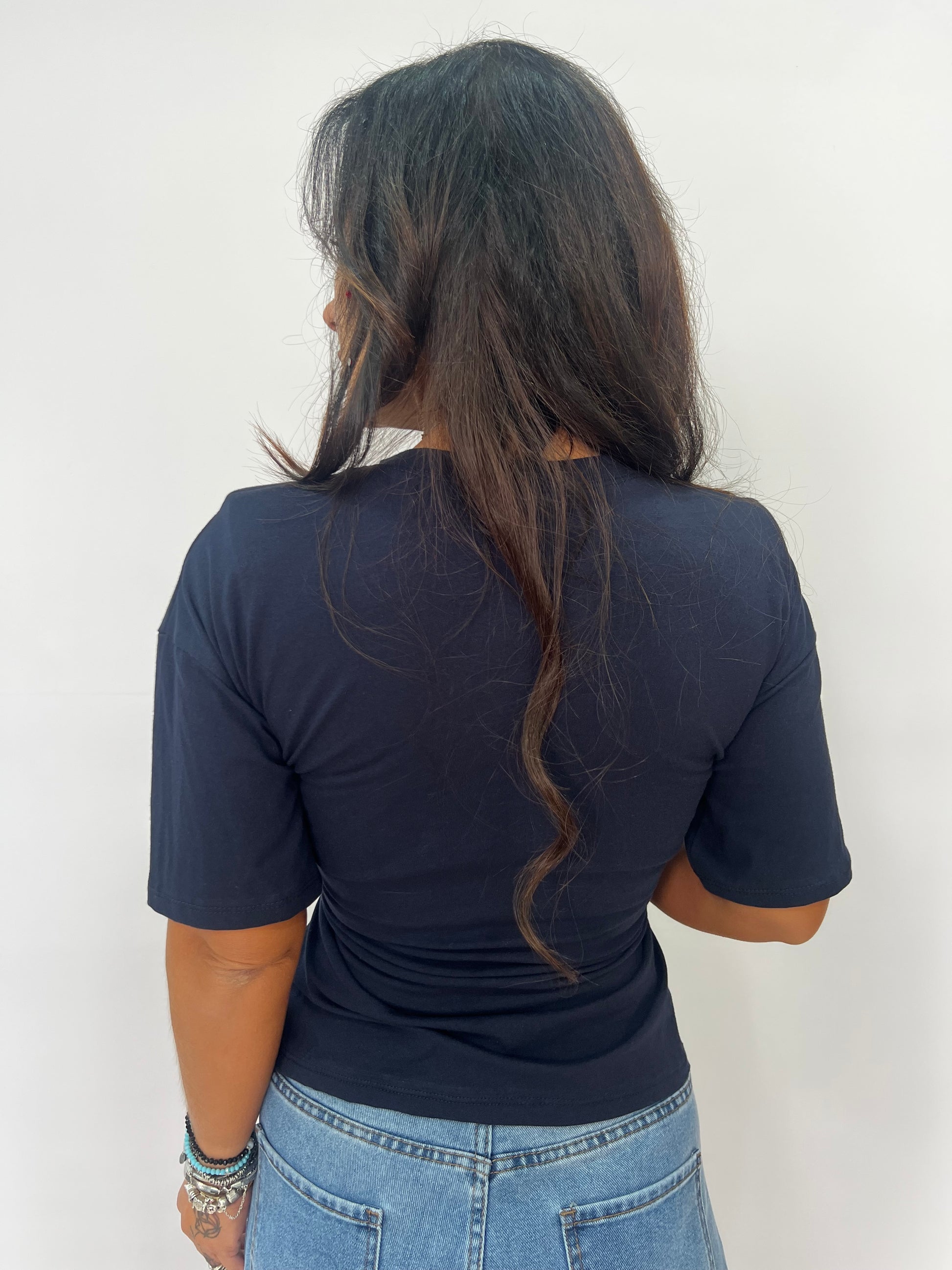 Questa T-shirt dallo stile casual-chic unisce semplicità e femminilità grazie al suo design con arriccio in vita e dettaglio metallico centrale che valorizza la silhouette. Realizzata in tessuto morbido e leggero, offre una vestibilità confortevole e fluida, perfetta per ogni occasione quotidiana o per un look più curato con accessori eleganti. Disponibile in un’ampia gamma di colori — nero, marrone, bianco, bordeaux, beige e blu navy — si abbina facilmente sia a jeans che a gonne o pantaloni più formali.