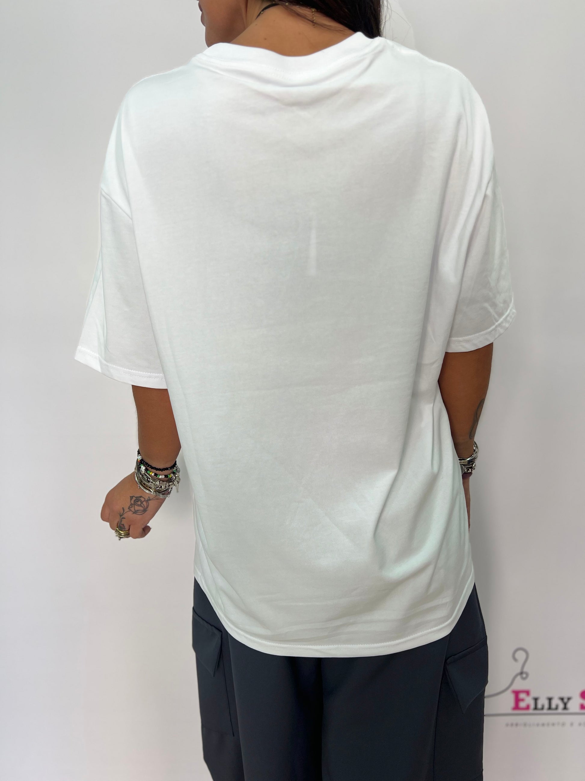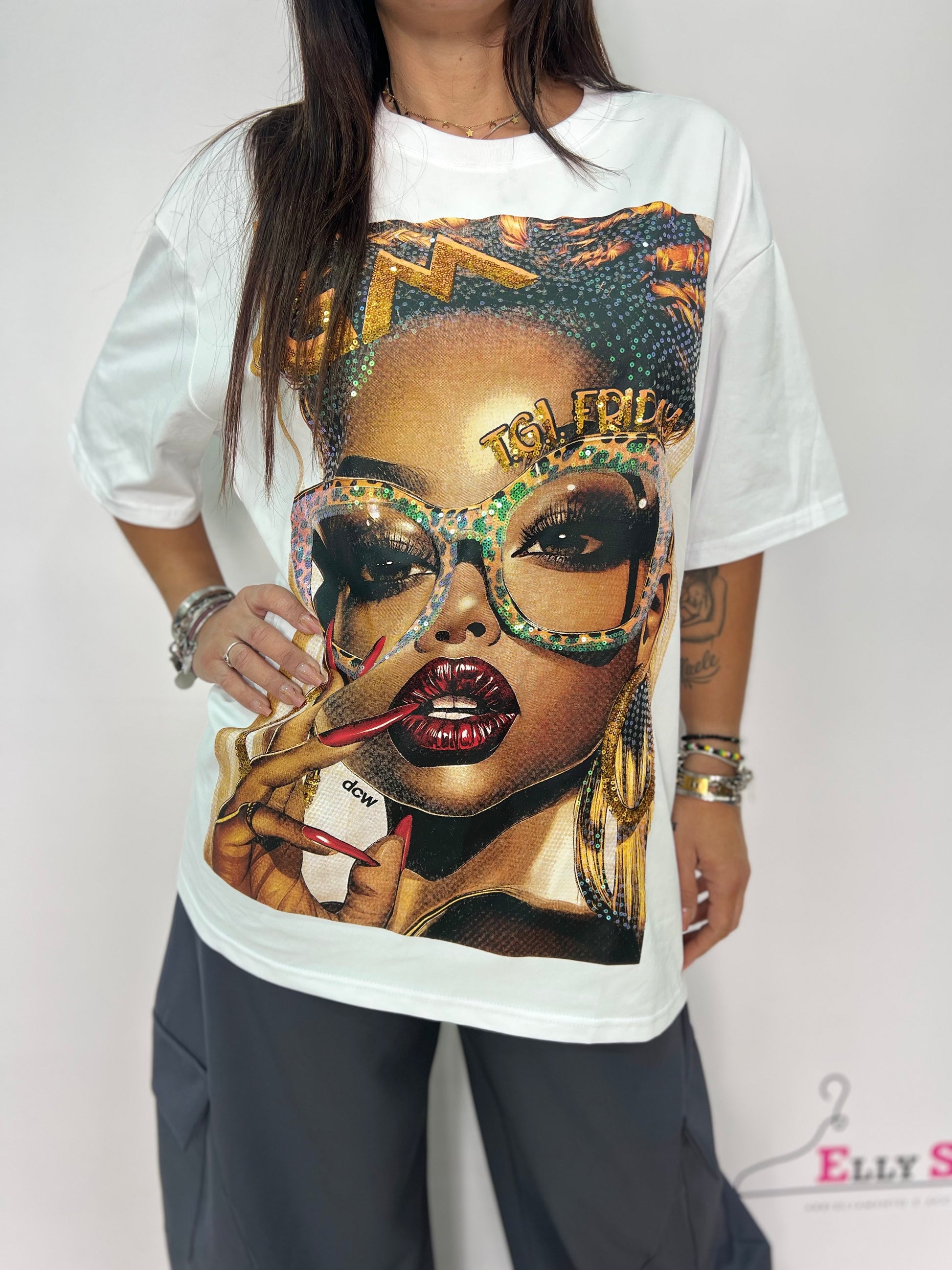 T-shirt donna dallo stile moderno e di forte impatto visivo, perfetta per chi ama distinguersi con un look urbano e ricercato. La vestibilità oversize garantisce comfort e libertà di movimento, adattandosi facilmente a diverse fisicità. Il design è valorizzato da una maxi stampa frontale in stile fashion glamour, con dettagli luminosi effetto brillante che donano carattere e originalità al capo. Il colore bianco la rende versatile e facilmente abbinabile a pantaloni, jeans o outfit più eleganti per creare contrasti di stile. Ideale per il tempo libero, uscite casual o look street-chic.