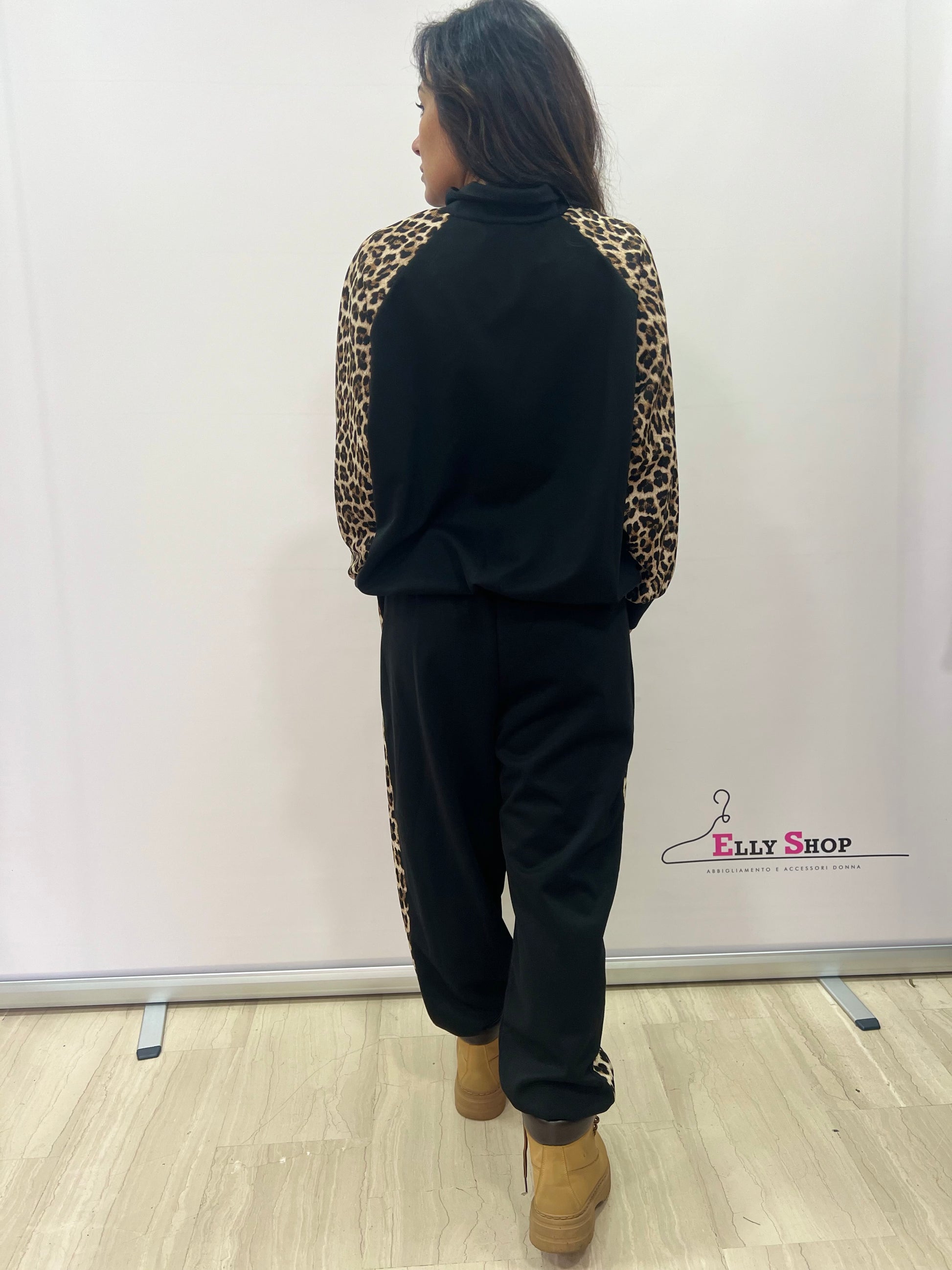 Dettaglio: Giacca con zip frontale e collo alto, maniche con stampa animalier; pantalone con elastico in vita e cordino regolabile, bande laterali animalier