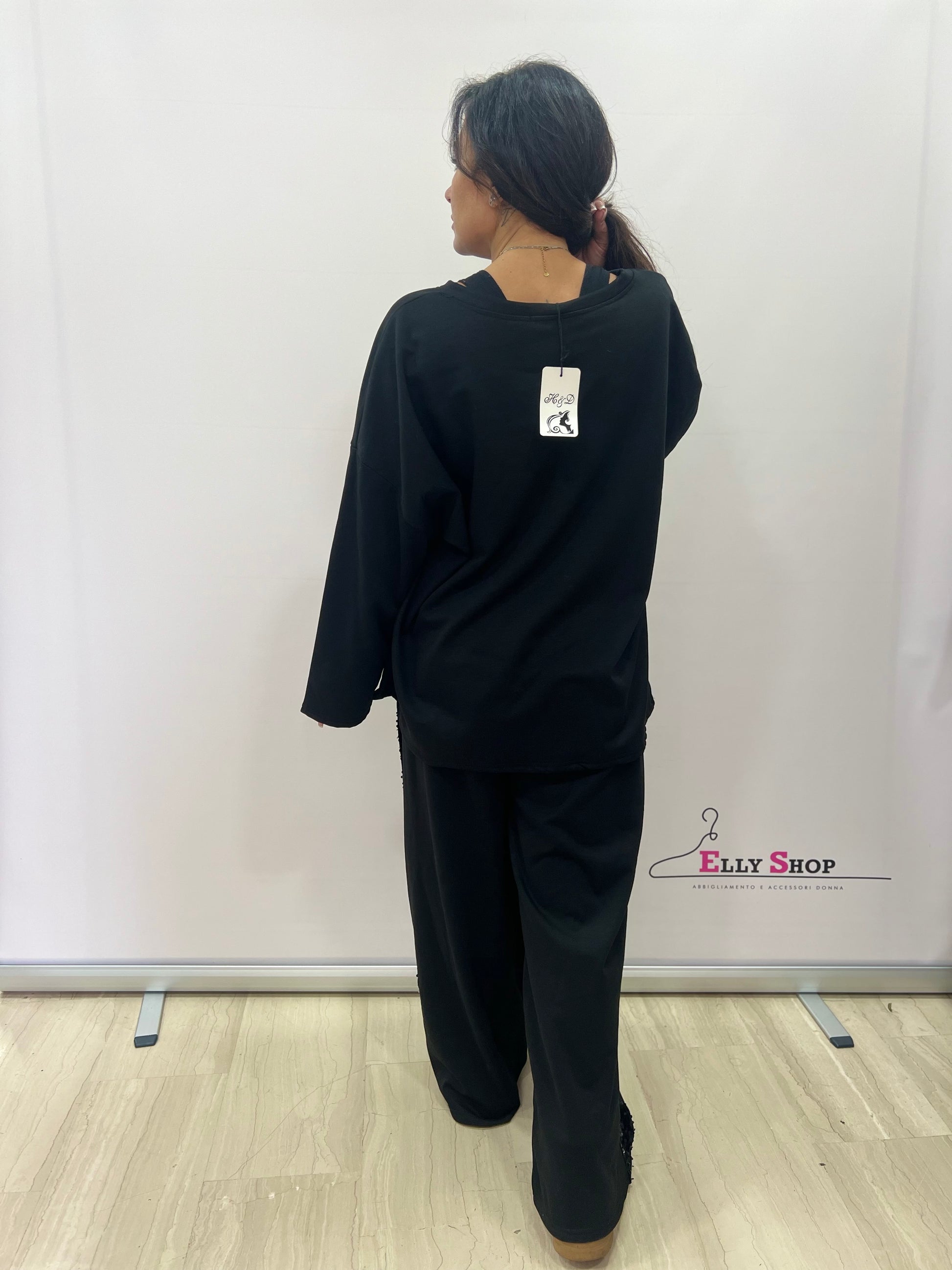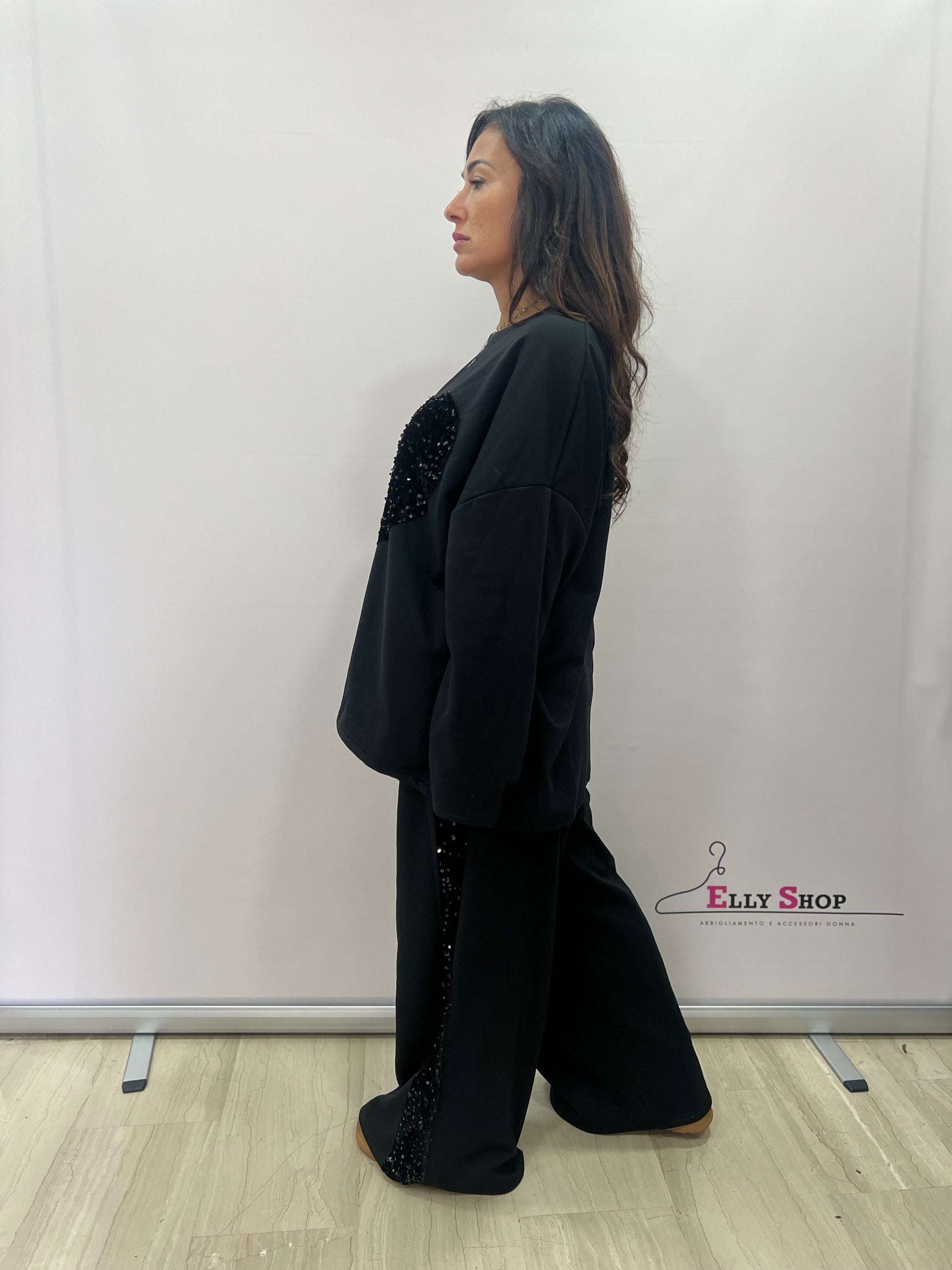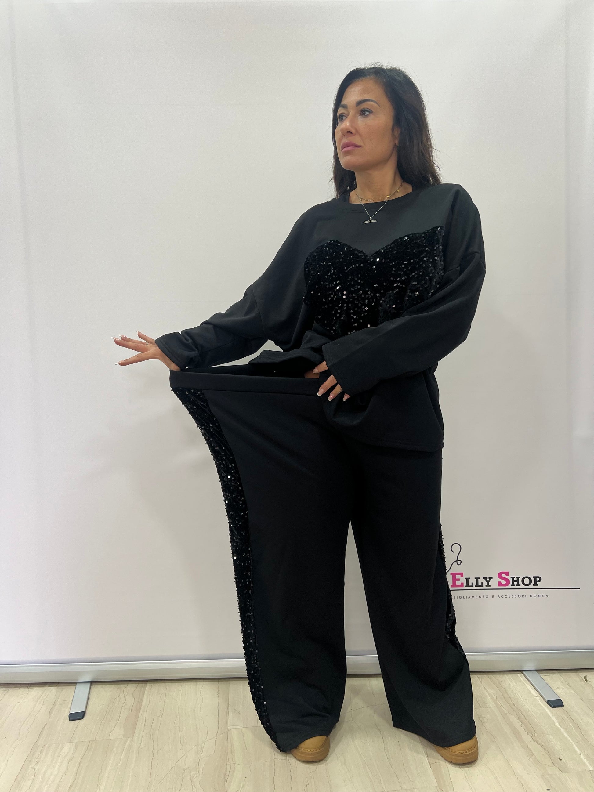 Tuta completa dal design raffinato e contemporaneo, caratterizzata da un maxi inserto glitter a forma di cuore sul davanti e da bande laterali coordinate sui pantaloni. Il taglio morbido e fluido garantisce comfort assoluto, valorizzando la silhouette curvy con stile. Perfetta per occasioni casual chic, serate informali o eventi in cui si desidera un look comodo ma ricercato. Disponibile in diverse varianti colore – nero, bordeaux e marrone – dona un tocco brillante senza rinunciare alla praticità.