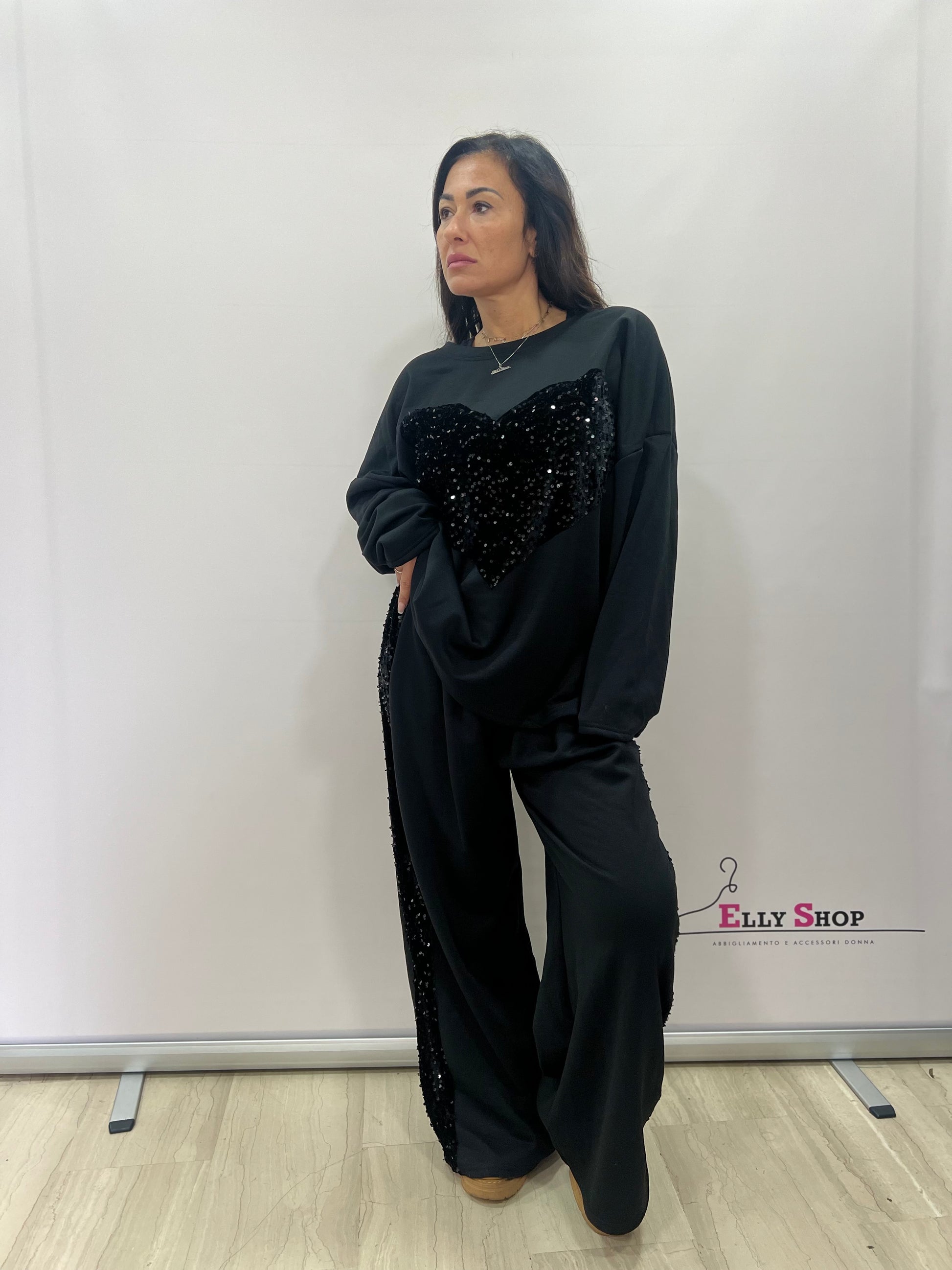 Dettaglio: Maxi cuore glitter sul davanti; bande laterali glitterate sul pantalone; top a maniche lunghe con linea morbida; pantalone ampio a gamba larga
